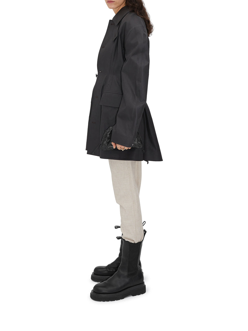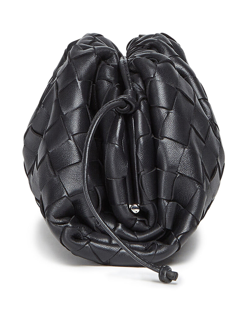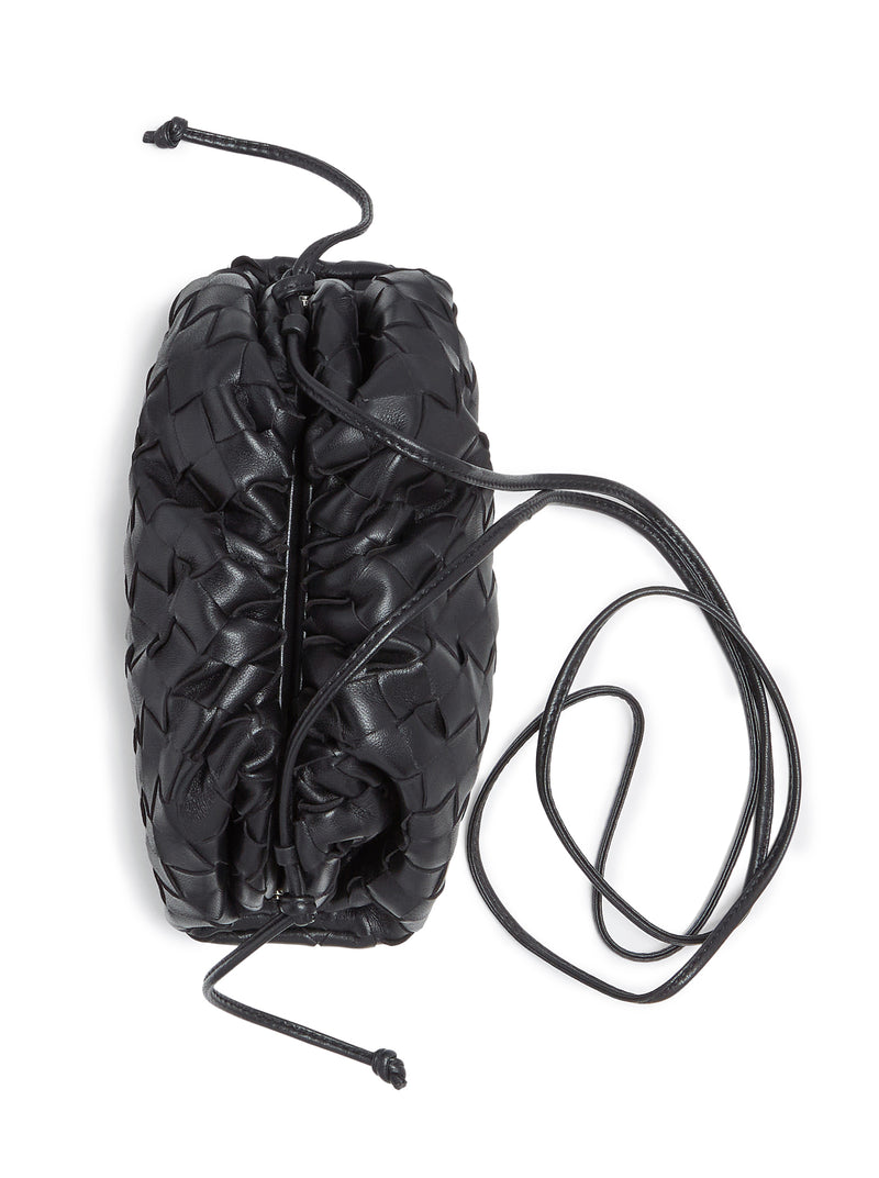 - Mini leather clutch with Intrecciato motif and shoulder strap - Single compartment - Magnetic snap closure - Material: Lambskin, Brass - Interior: Lambskin - Color: Black - Metal accessories: silver finish - Height: 13 cm - Width: 22 cm - Depth: 5 cm - Shoulder strap drop: 66 cm