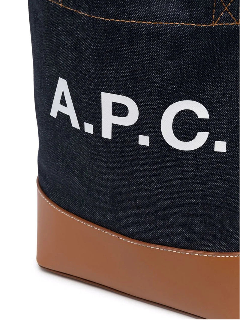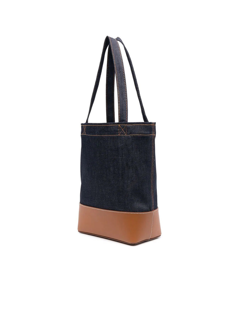 Blue, brown, leather, logo print on the front and internal zip pocket