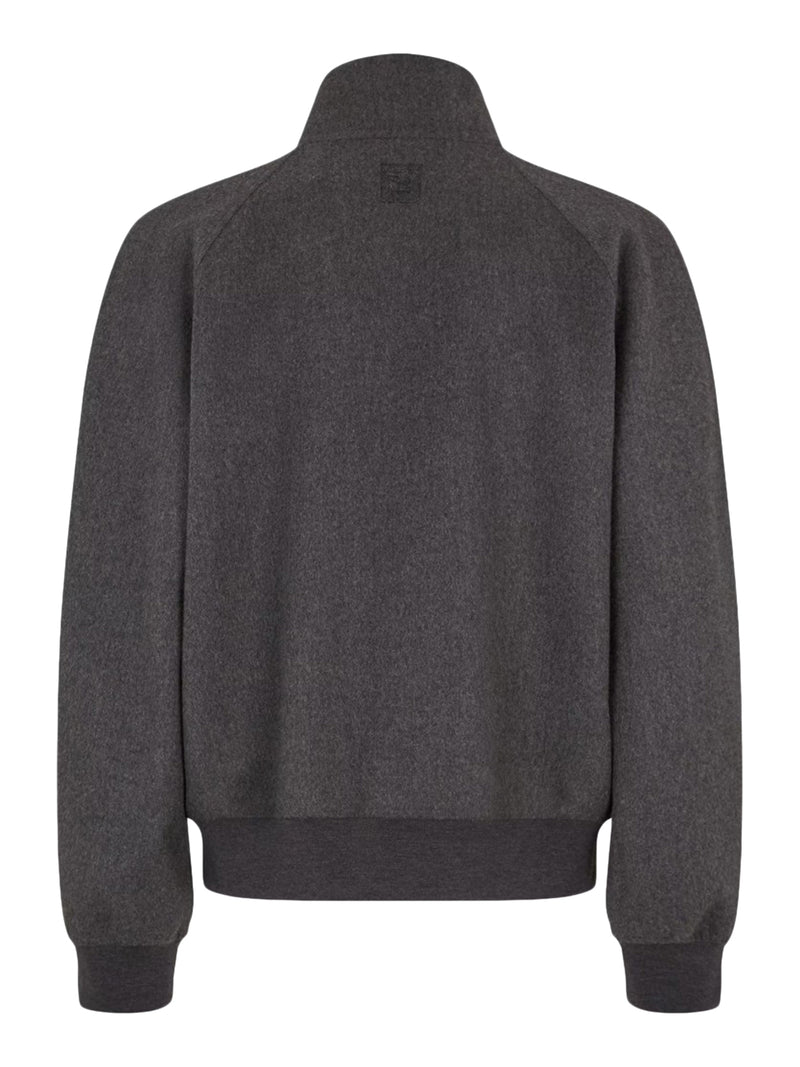 -Blouson with high collar and long raglan sleeves -Elastic knit cuffs and hem -Diagonal pockets on the sides -Fendt O`Lock double-slider zip fastening -Made of lightweight dark grey cashmere fabric -Personalised with a raised FF patch embroidered in tone on the back of the collar -Palladium-finish metal accessories