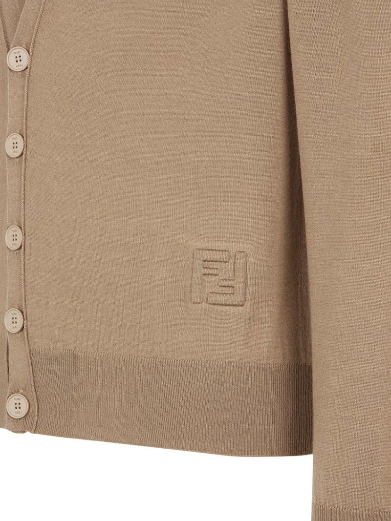 -V-neck cardigan -button fastening in matching tone -ribbed edges -light brown wool yarn -finished with embossed FF detail on the bottom