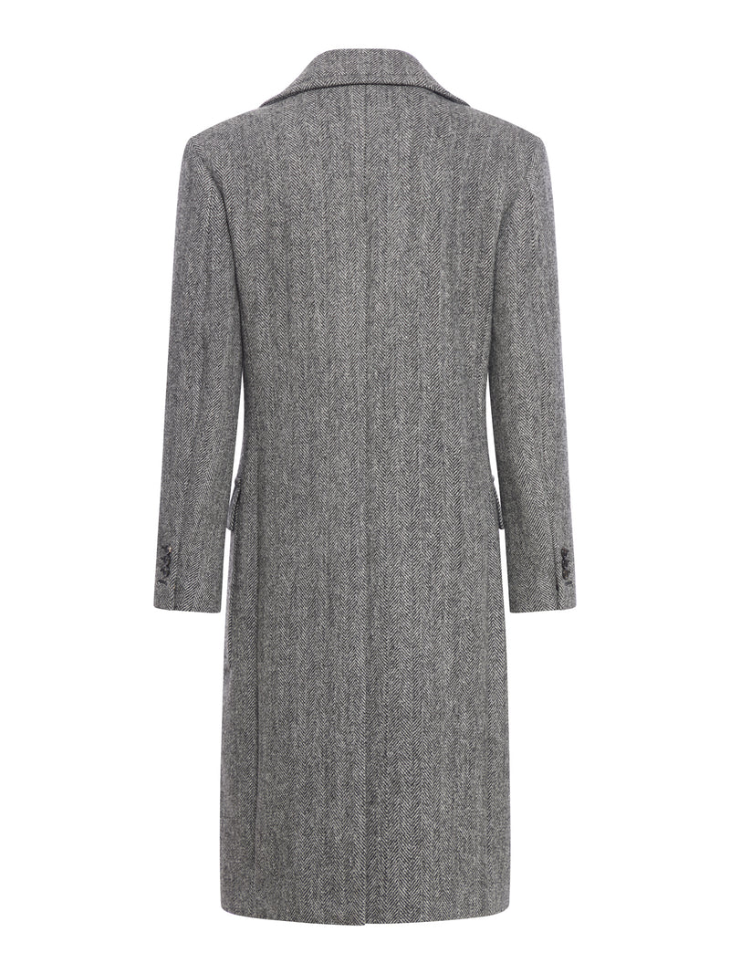 -Double-breasted coat by Bottega Veneta made of black and grey herringbone wool -wide lapels -front closure with buttons -structured shoulders -long sleeves with buttoned cuffs -multiple pockets -central vent on the back -lined interior
