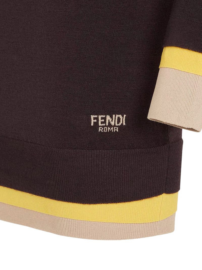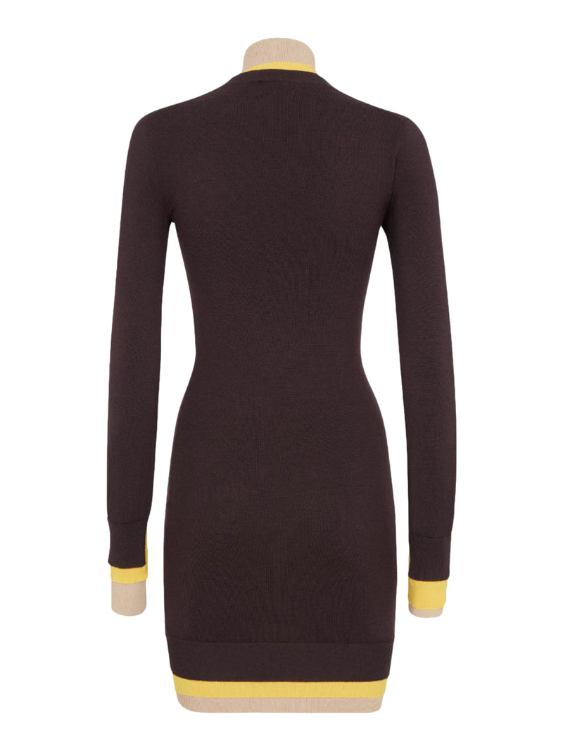-Short dress with a fitted silhouette -High neck and long set-in sleeves -Made from dark purple wool knit -The multi-layered ribbed details, in shades of yellow and beige, create a trompe-l'oeil effect on the neck, cuffs and hem -Finished with a contrasting inlaid Fendi Roma logo on the hem