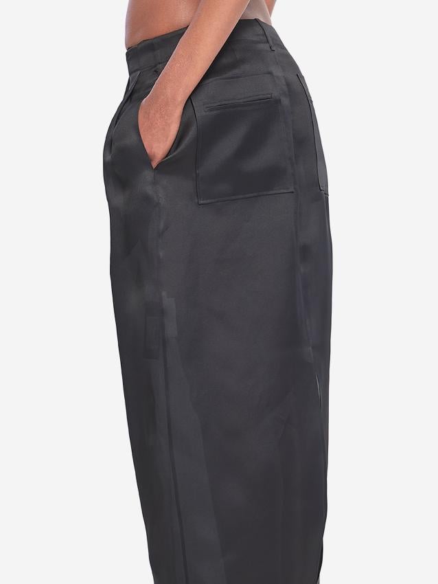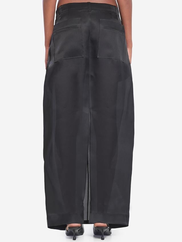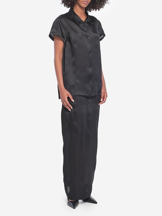 Lucian long skirt in semi-sheer black silk organza. It features a button and zip closure, belt loops, front pleats, two in-seam side pockets, two