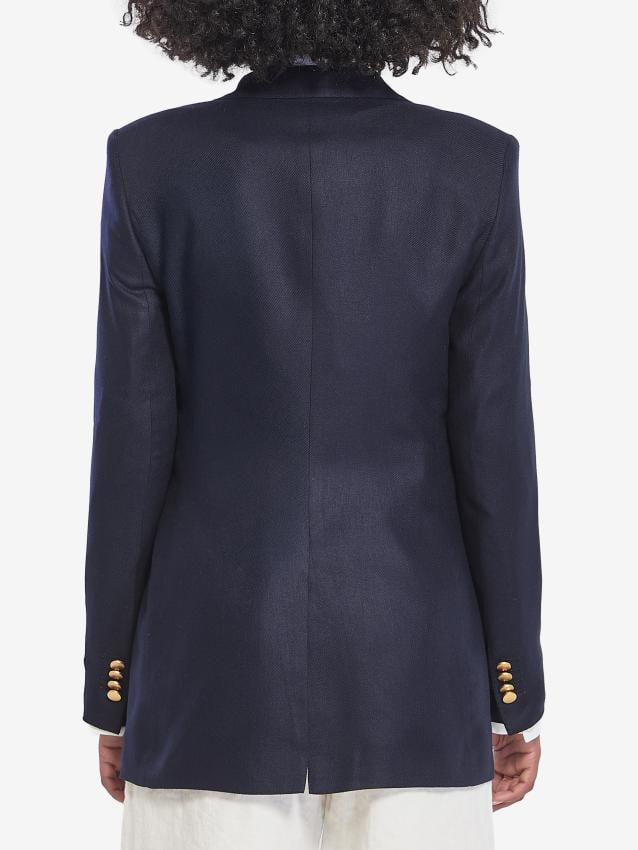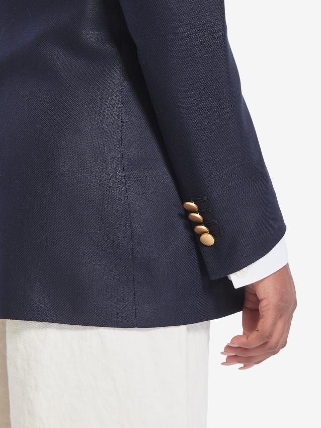Single-breasted jacket in navy blue silk. It features notch lapels, single-breasted gold button closure, two front flap pockets, cuffs with gold