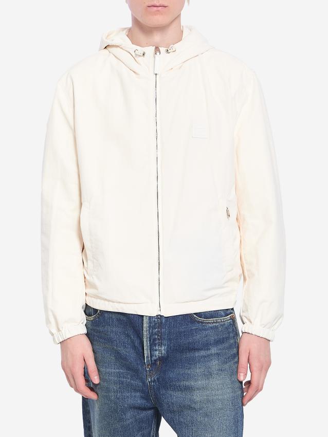 Reversible hooded jacket in white sheepskin leather on one side and white nylon on the other. The leather side features a zip closure with a leather
