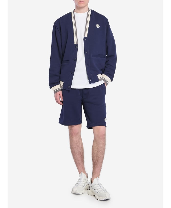 Moncler x Mercedes-Benz by Nigo cardigan in dark blue cotton jersey with a padded nylon back and ribbed white and gray trims. It features a V-neck,