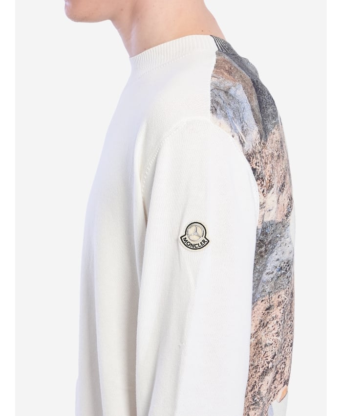 Moncler x Mercedes-Benz by Nigo crew-neck sweater in white flat-knit cotton. It features a logo and car print on the back, a Moncler x Mercedes-Benz
