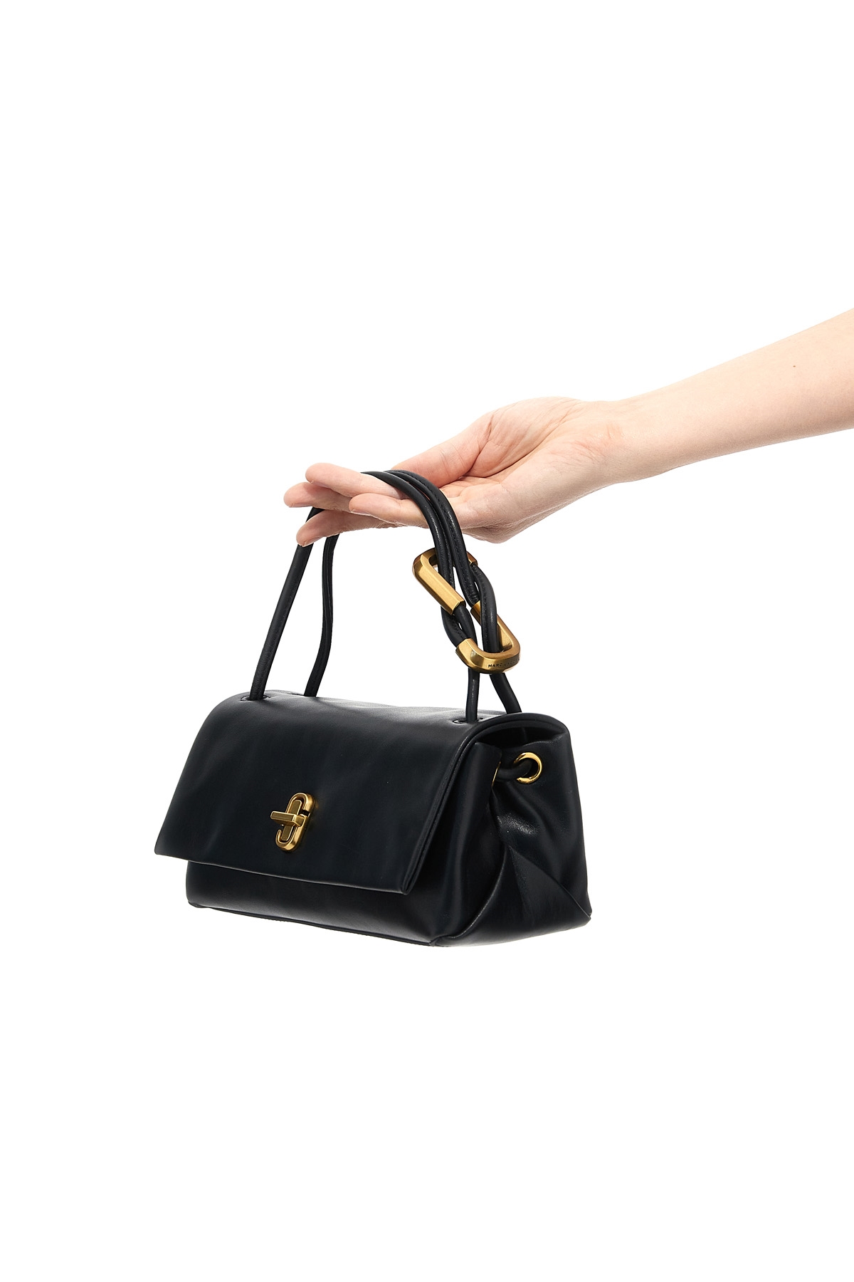 'The Mini Dual' smooth Italian leather handbag, antiqued metal turn flap closure, sliding handle.
