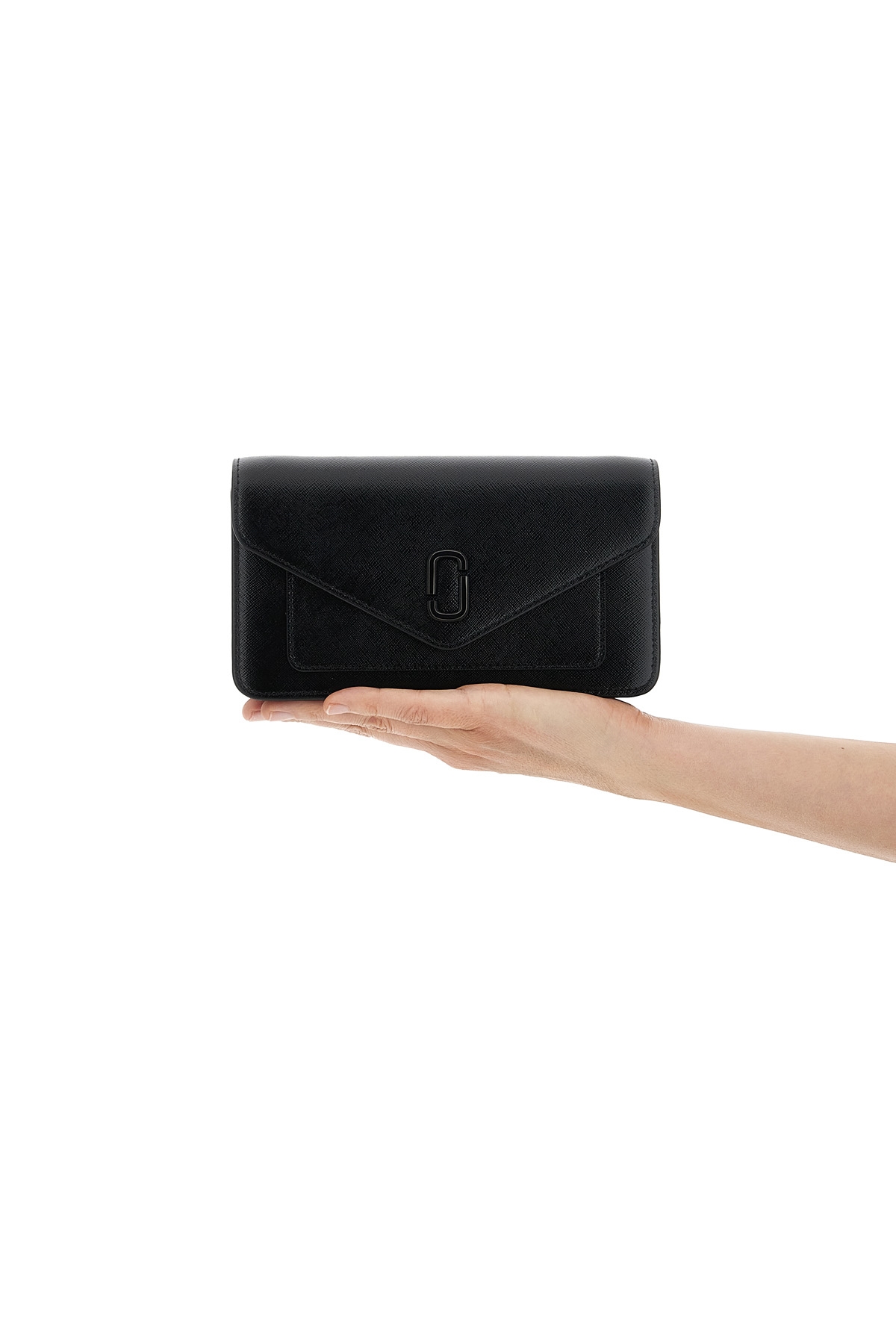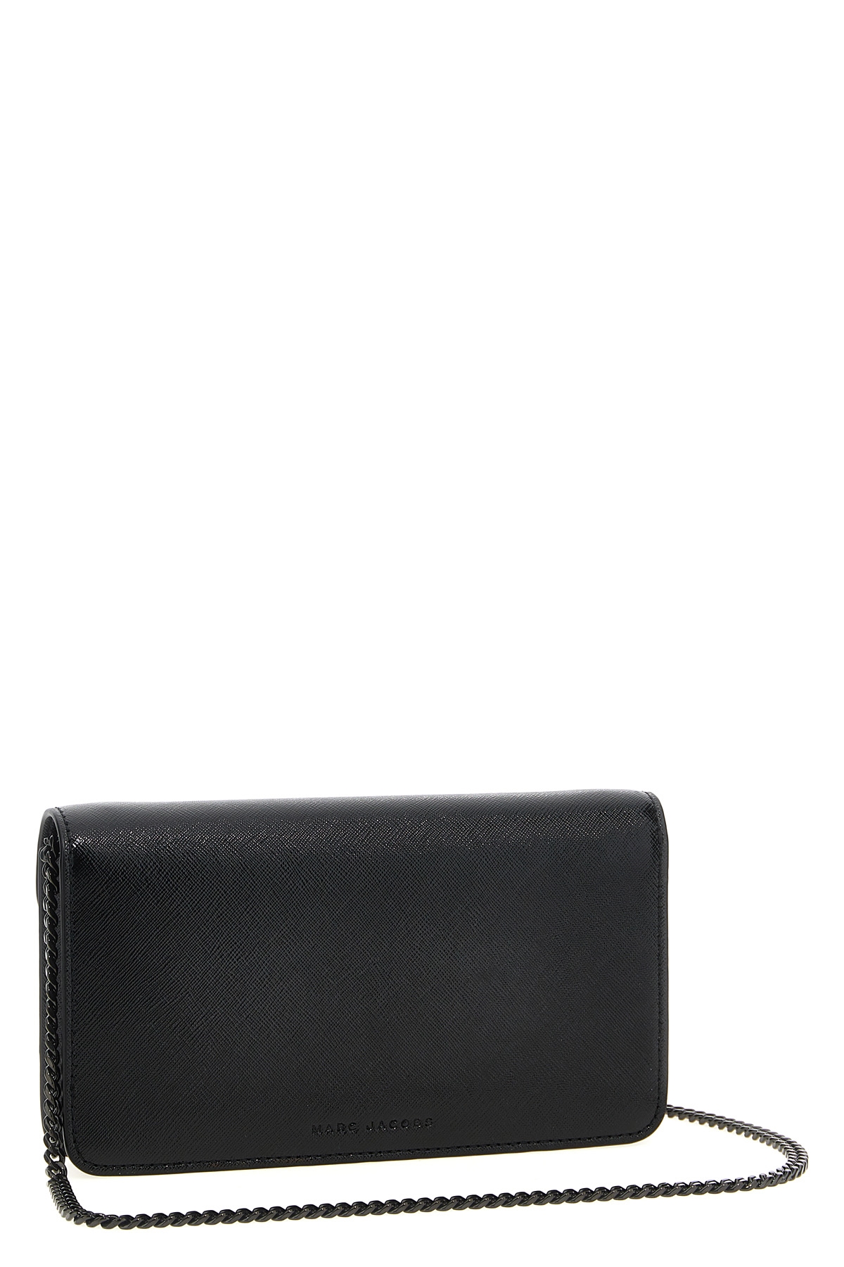 'The Longshot' wallet on chain in Saffiano leather, magnetic flap closure with front metal logo, removable chain shoulder strap.