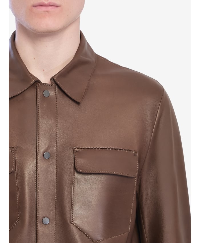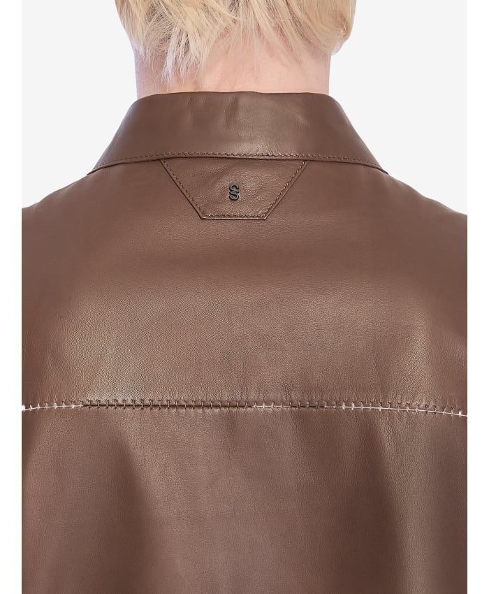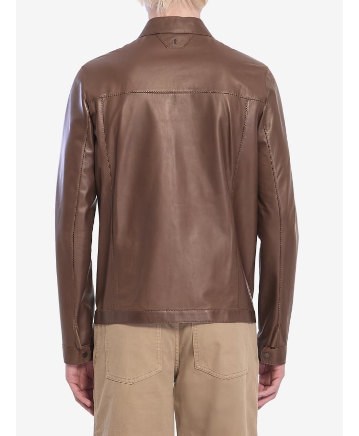 Leather jacket in Cookie color. It features a pointed collar, front snap button closure, two flap patch pockets on the chest, two in-seam side
