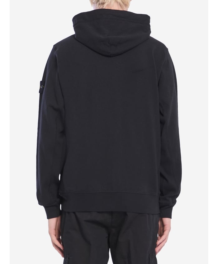 Hoodie in black slub cotton with a slub-effect texture. It features a shaped drawstring hood, front zip closure, two in-seam side pockets, a Stone