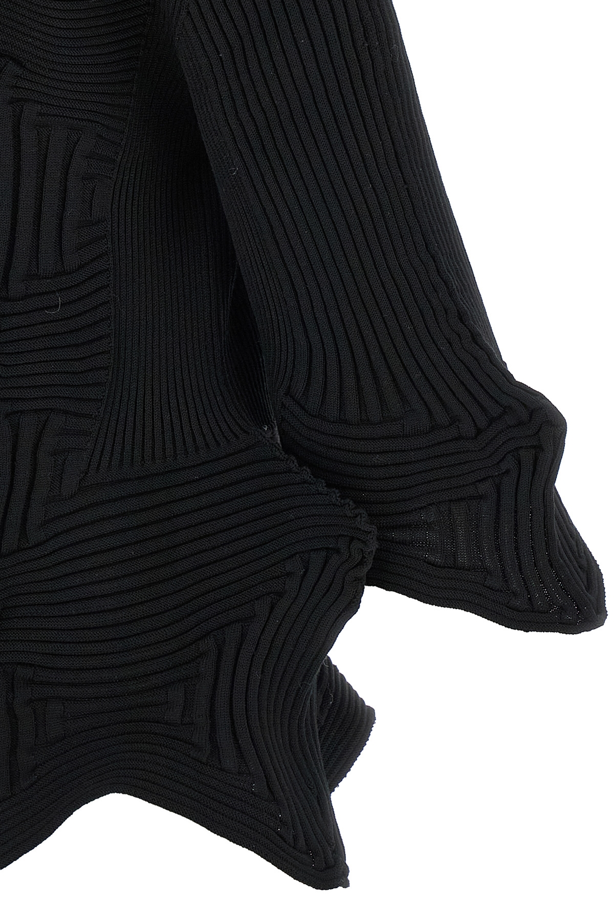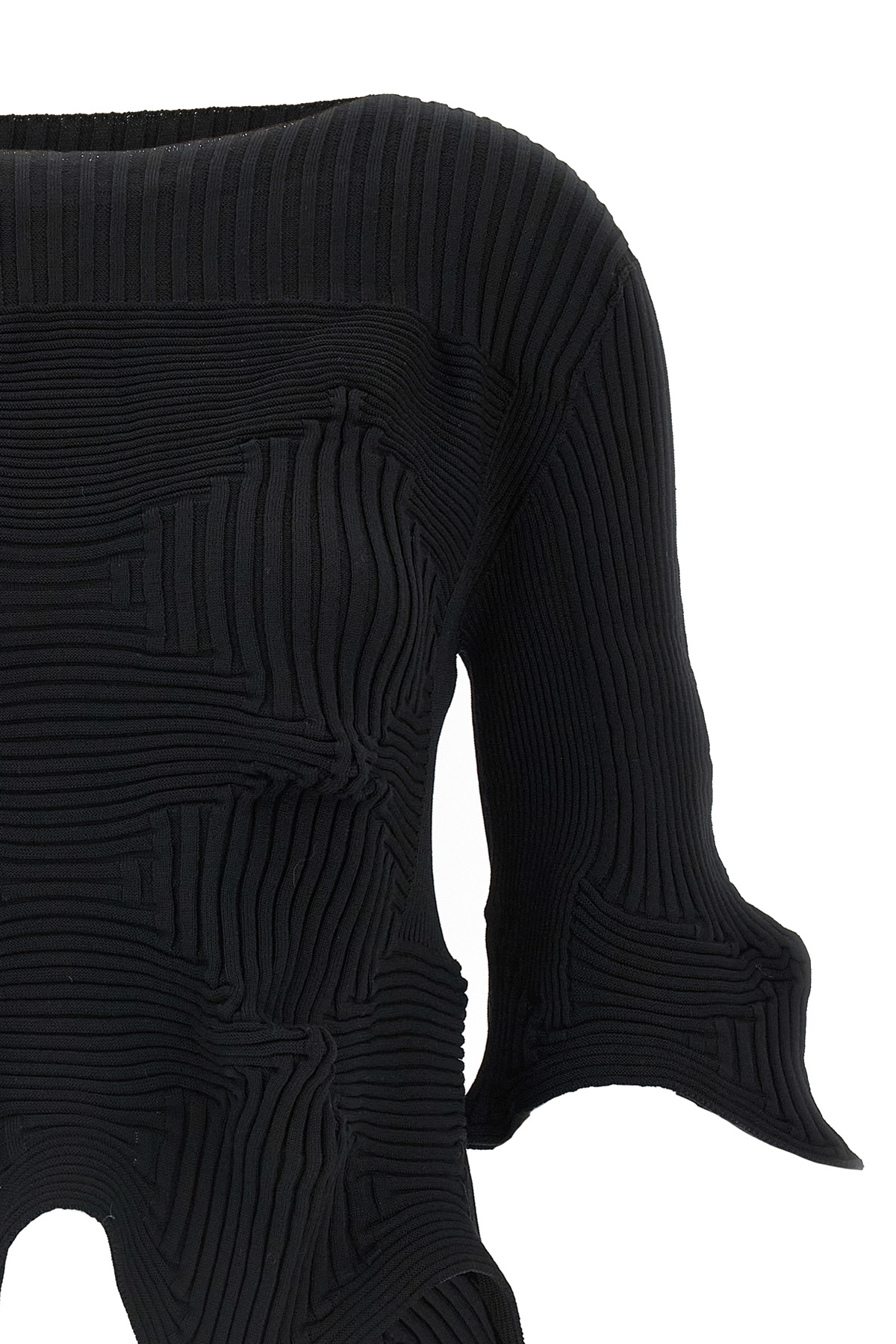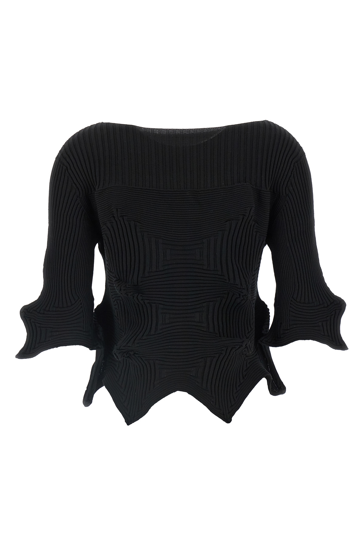 'Linkage' pleated fabric top with pointed geometric details, round neckline, and 3/4 sleeves.