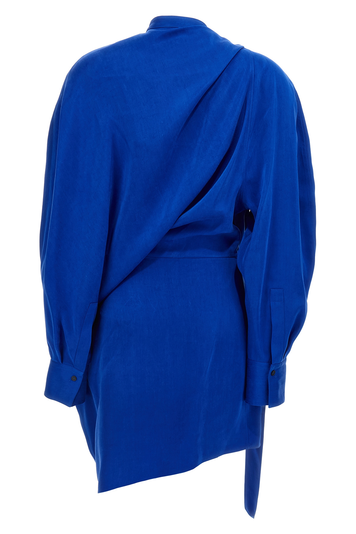 Mini dress, draped, asymmetrical lines, side button closure, Korean collar with knotted sash, bat sleeves with cuffs.