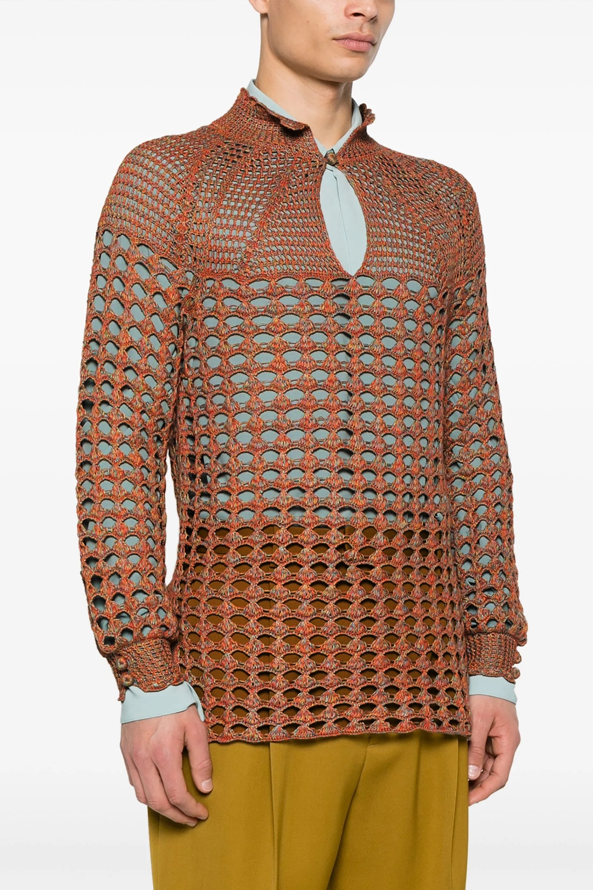 Openwork linen blend sweater, collar with opening button, long sleeves with buttons.