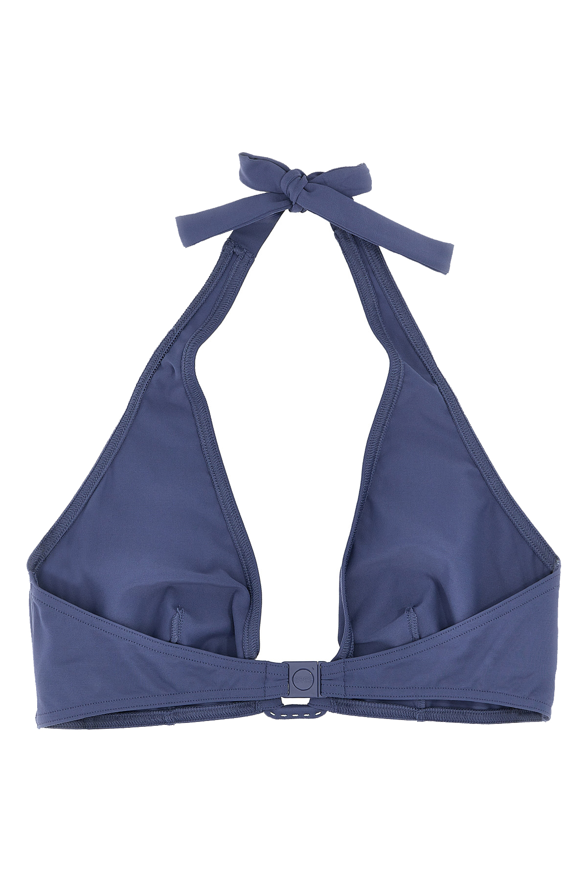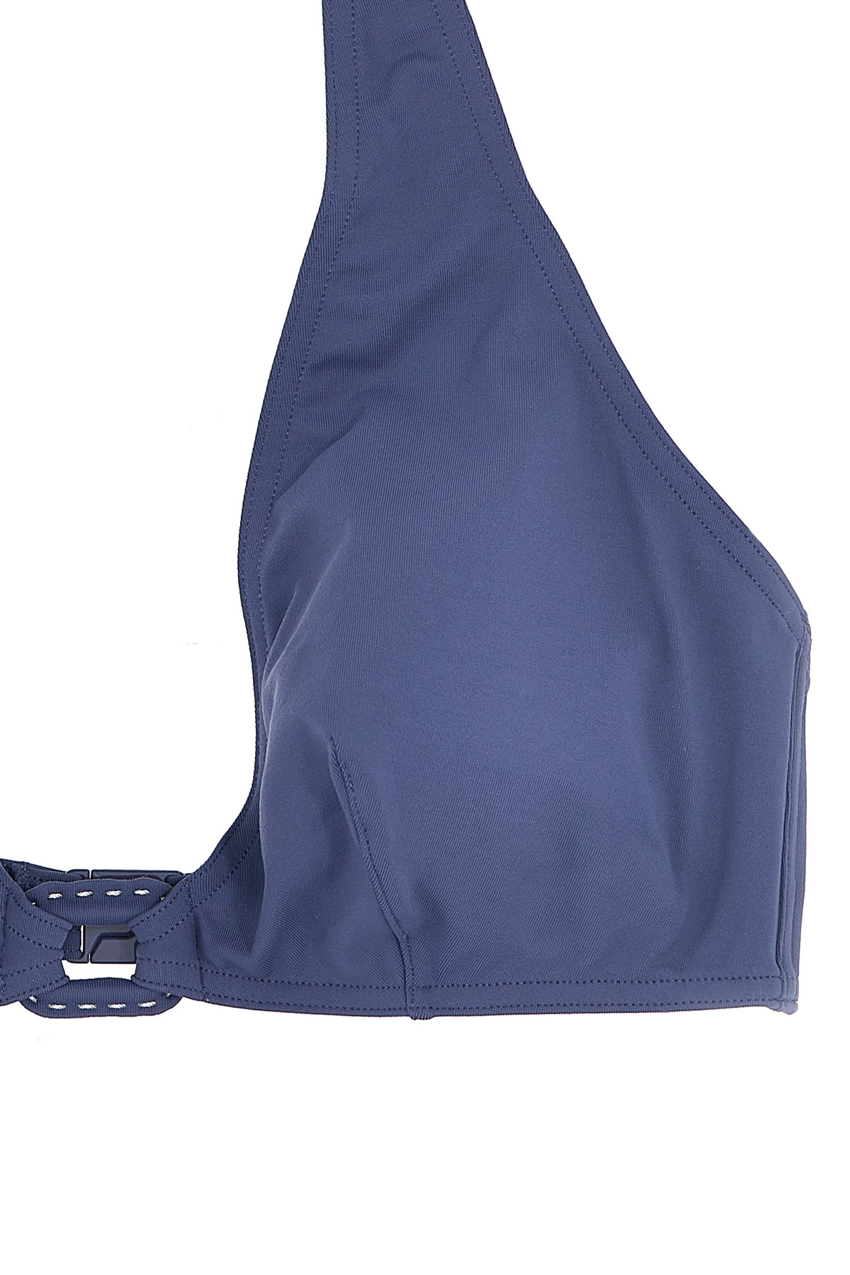 Navire' triangle bikini top in Peau Douce* fabric with front pincers and side underwires, cups separated by decorative buckle, adjustable neck strap and back hook.