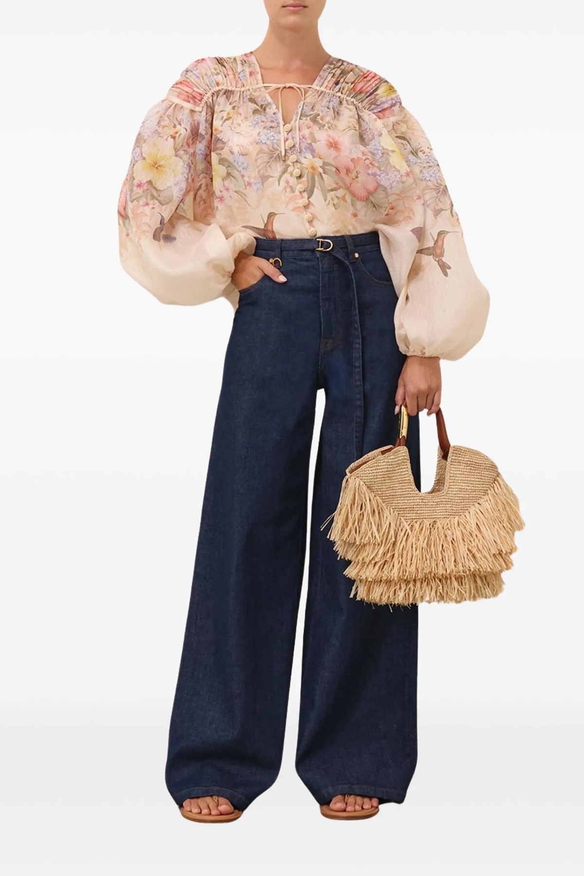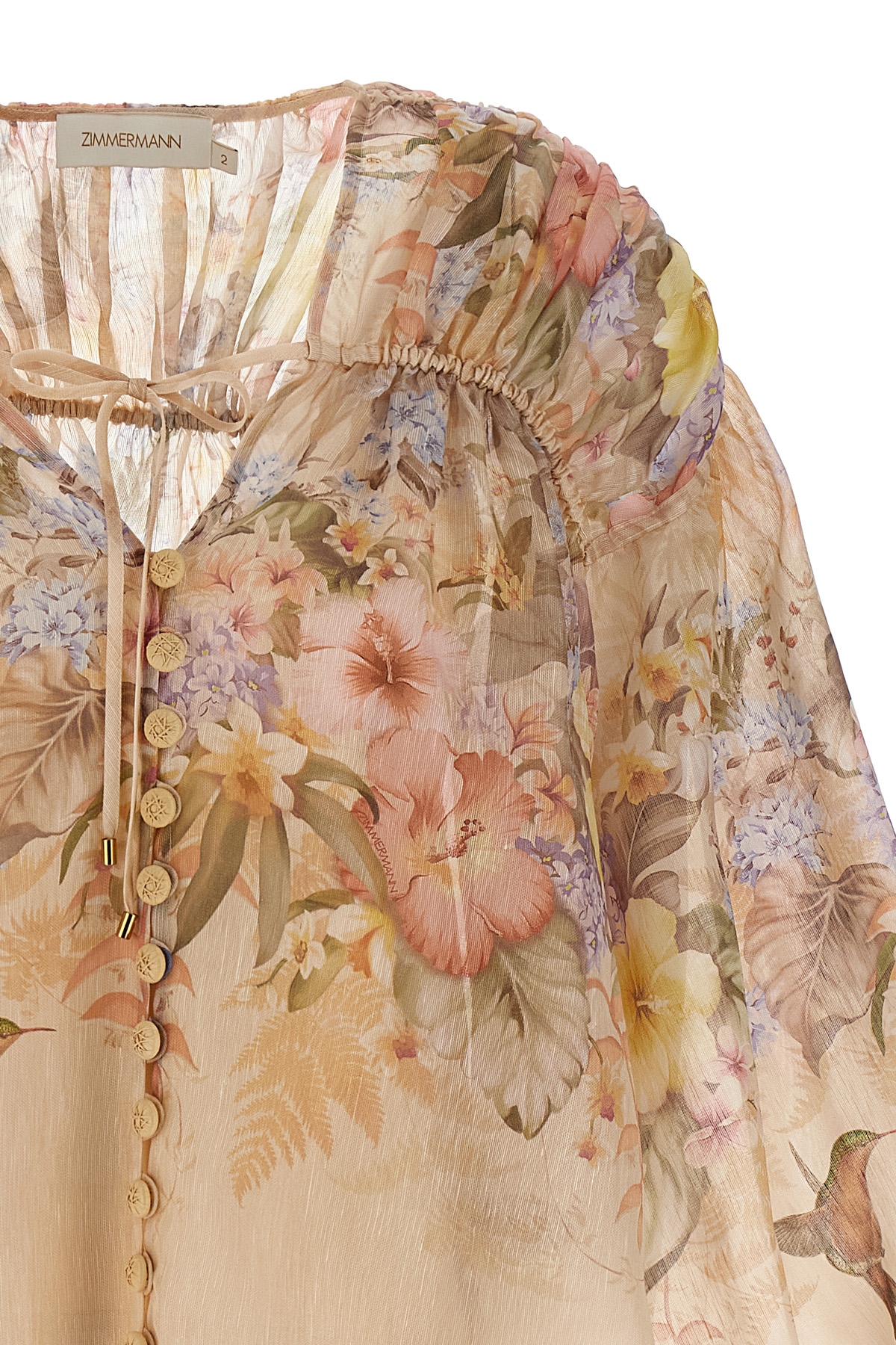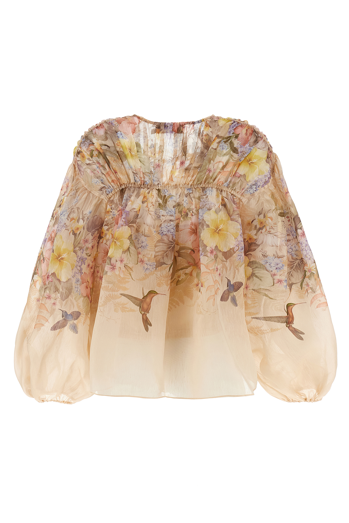 'Illuminate Drawn' blouse in silk and semi-transparent linen with floral print, V-neck with front button closure, drawstring to adjust curls, long balloon sleeves with elastic cuffs, removable top.
