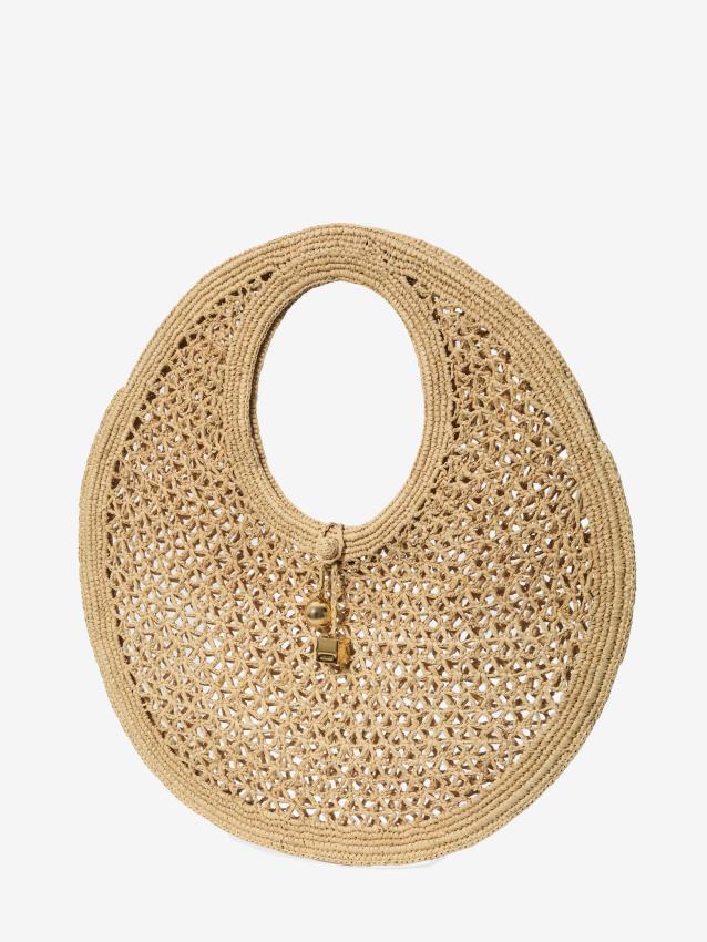 Round Beach shoulder bag in woven raffia. It features a knot closure, round and square metal charms with engraved logo, and reinforced woven edges.