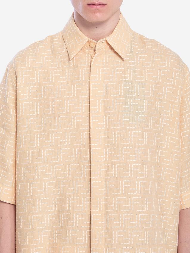 Oversized short-sleeve shirt in light yellow FF Jacquard linen. It features a semi-Italian collar, a concealed front button closure, and a straight
