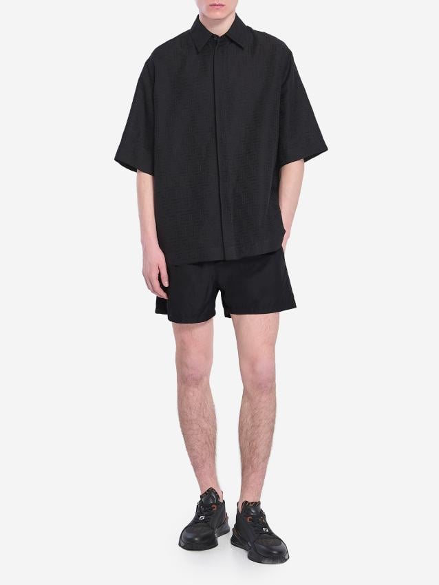 Oversized short-sleeve shirt in black FF Jacquard linen. It features a semi-Italian collar, a concealed front button closure, and a straight hem.The