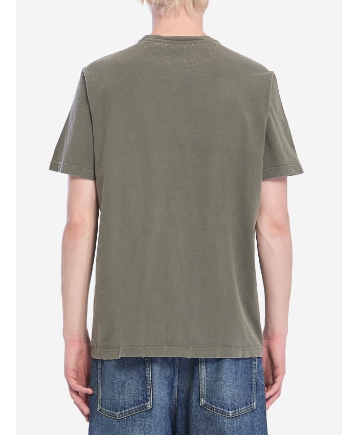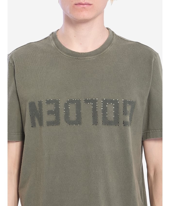 Short-sleeved crew-neck t-shirt in olive green cotton with a distressed treatment. It features a distressed Golden logo upside down on the chest,