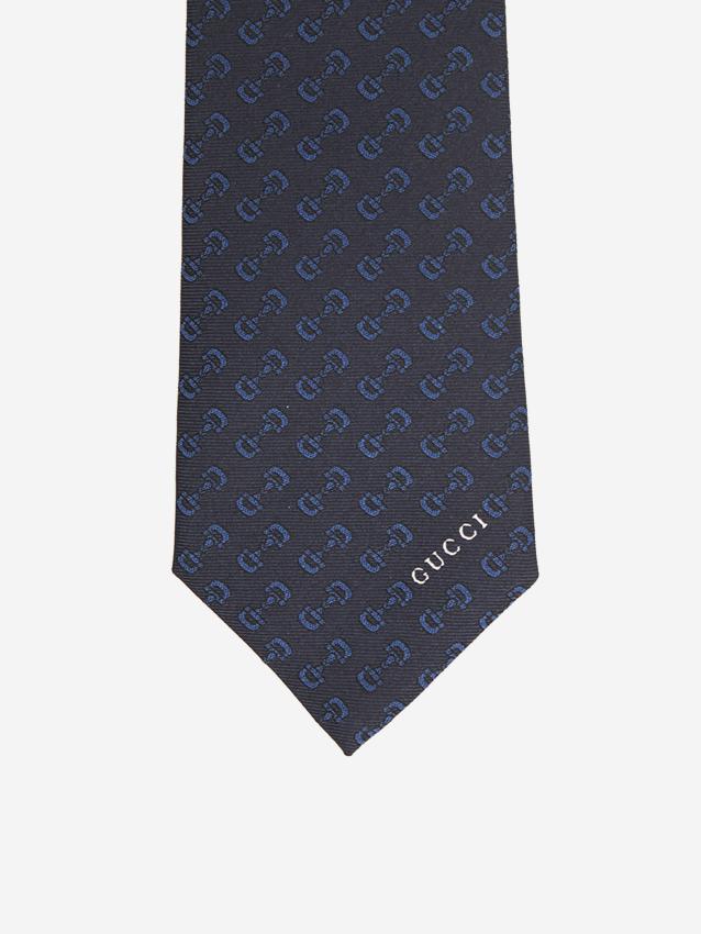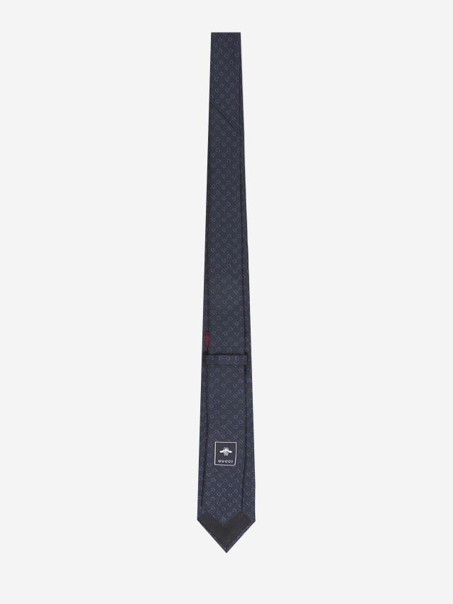 Silk tie with dark blue jacquard Horsebit pattern and diagonal white Gucci logo on the tip. Gucci label with embroidered bee detail on the