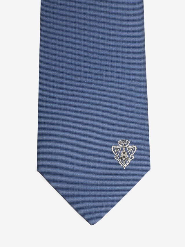 Blue jacquard silk tie with Gucci crest on the front and Gucci label with bee detail on the back.Dimensions: 148x7cm