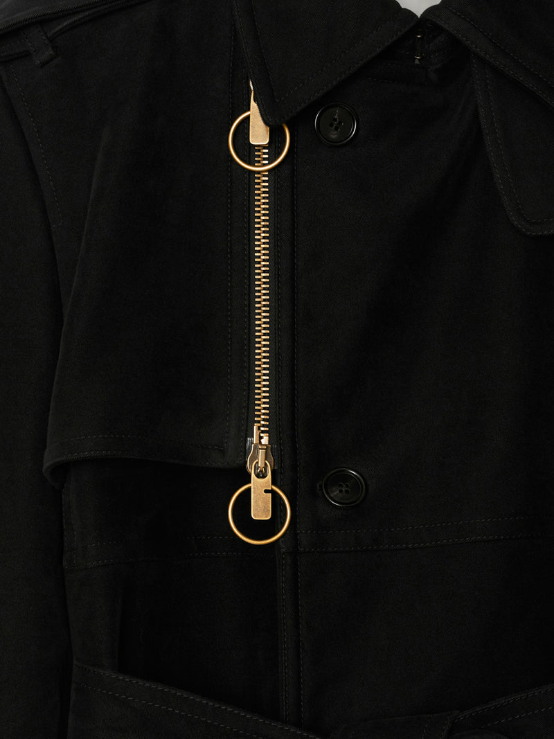- Double-breasted button fastening - Hook and eye collar - Chin strap - Shoulder pads - Belt with B-shaped buckle - Side welt pockets - Cuffs with strap - Back vent