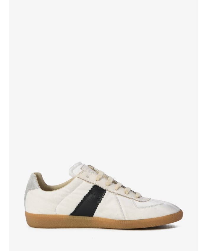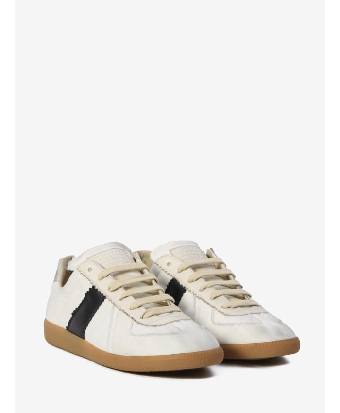 Replica sneakers in cotton drill, calfskin, and suede leather with a vintage treatment and worn effect. They feature a round toe, lace-up closure,