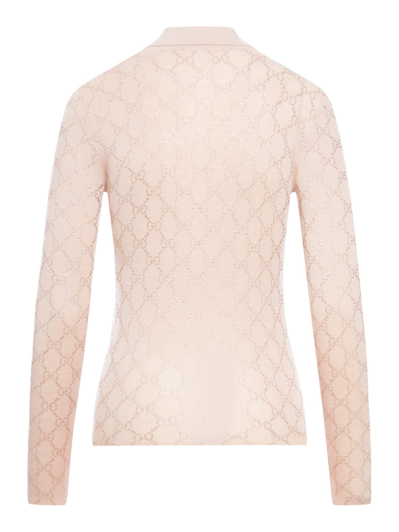 - Slim fit - Fine knit - Antique pink wool - Button fastening on the front - Allover GG in tone-on-tone rhinestones