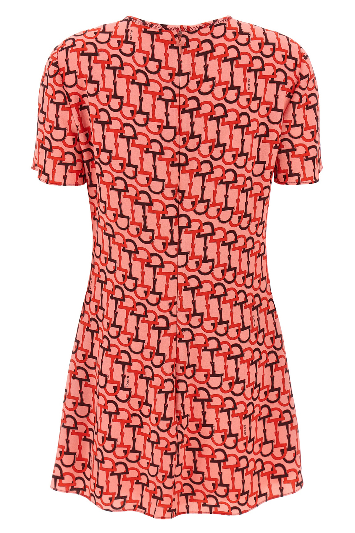 Viscose mini dress, crew neck, all-over clamp print, sheath design, back zip and hook closure, short sleeves.