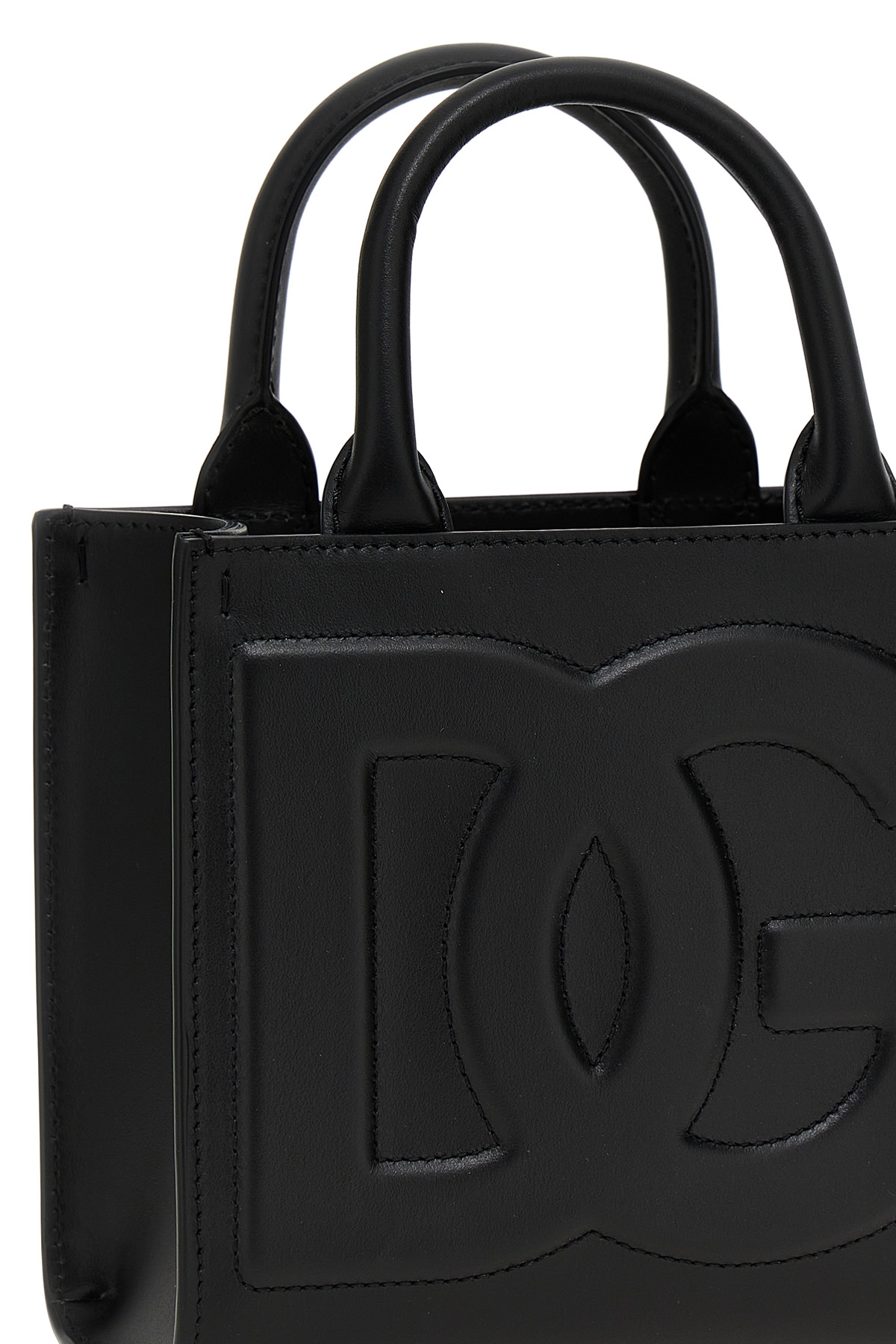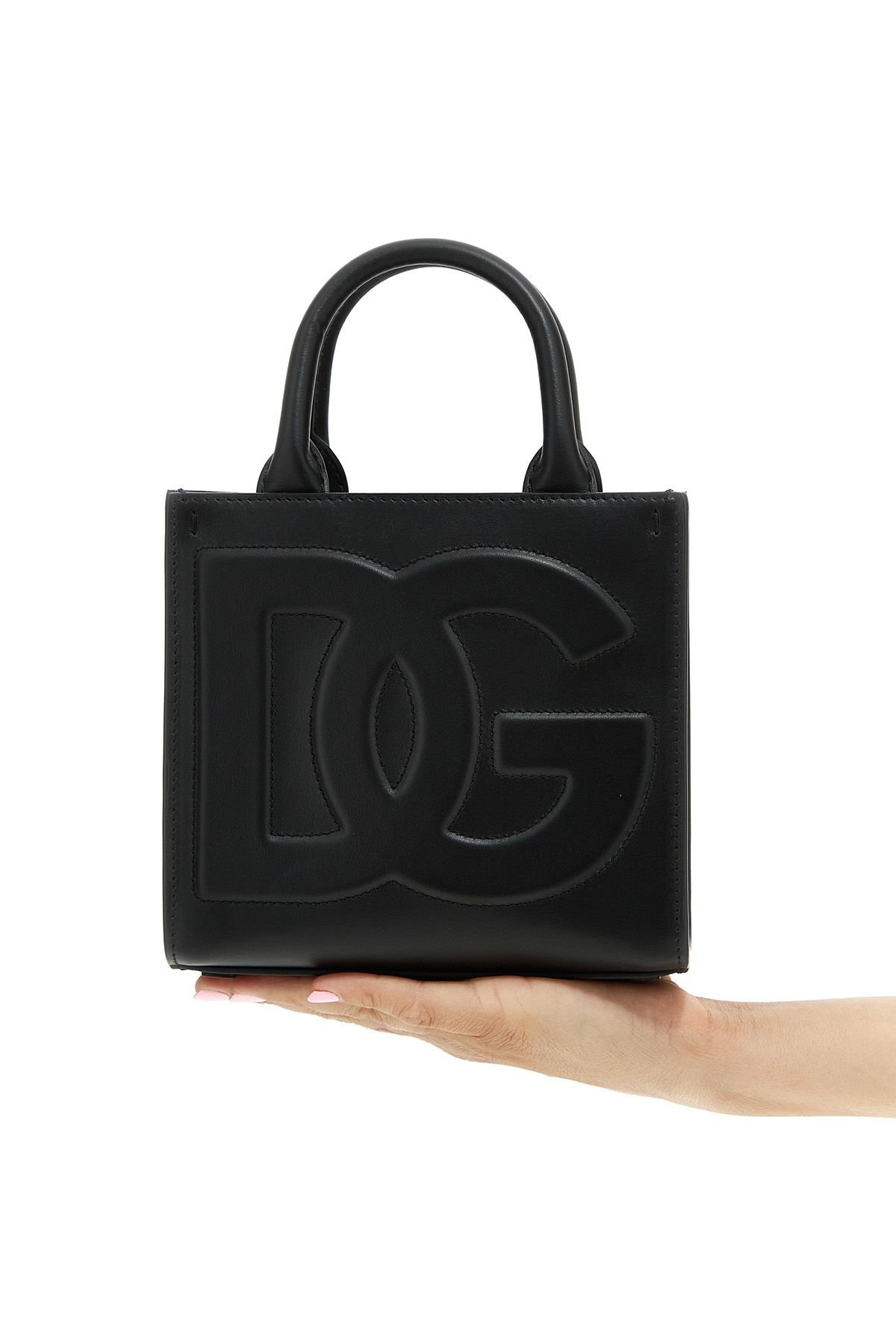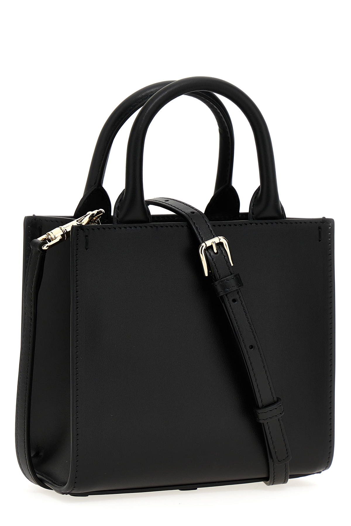 Leather shopping bag with front logo, double handle, adjustable and removable shoulder strap.
