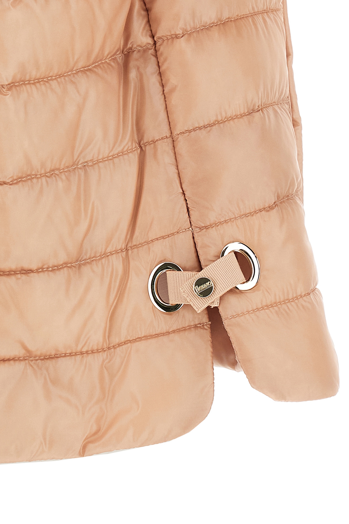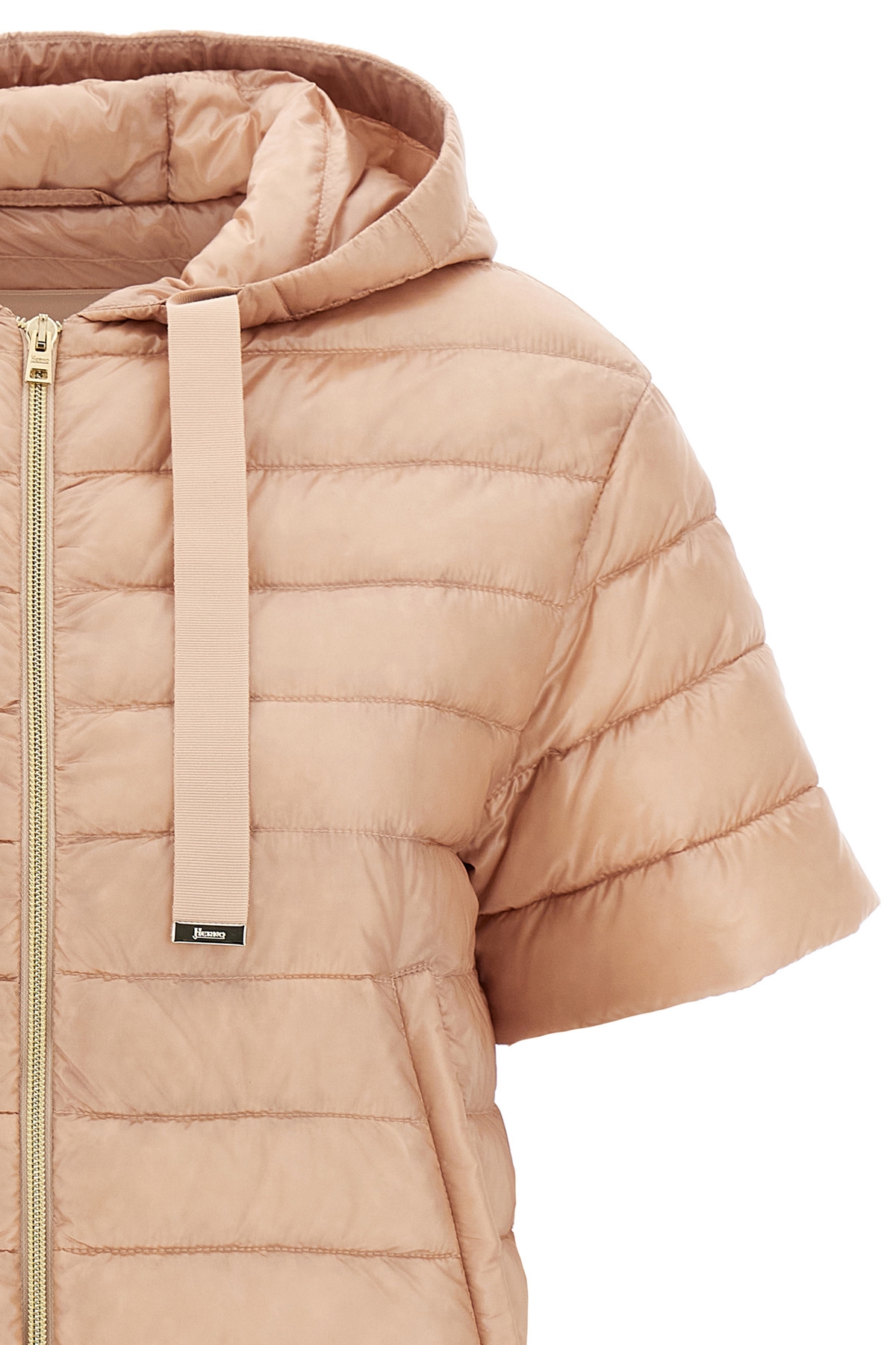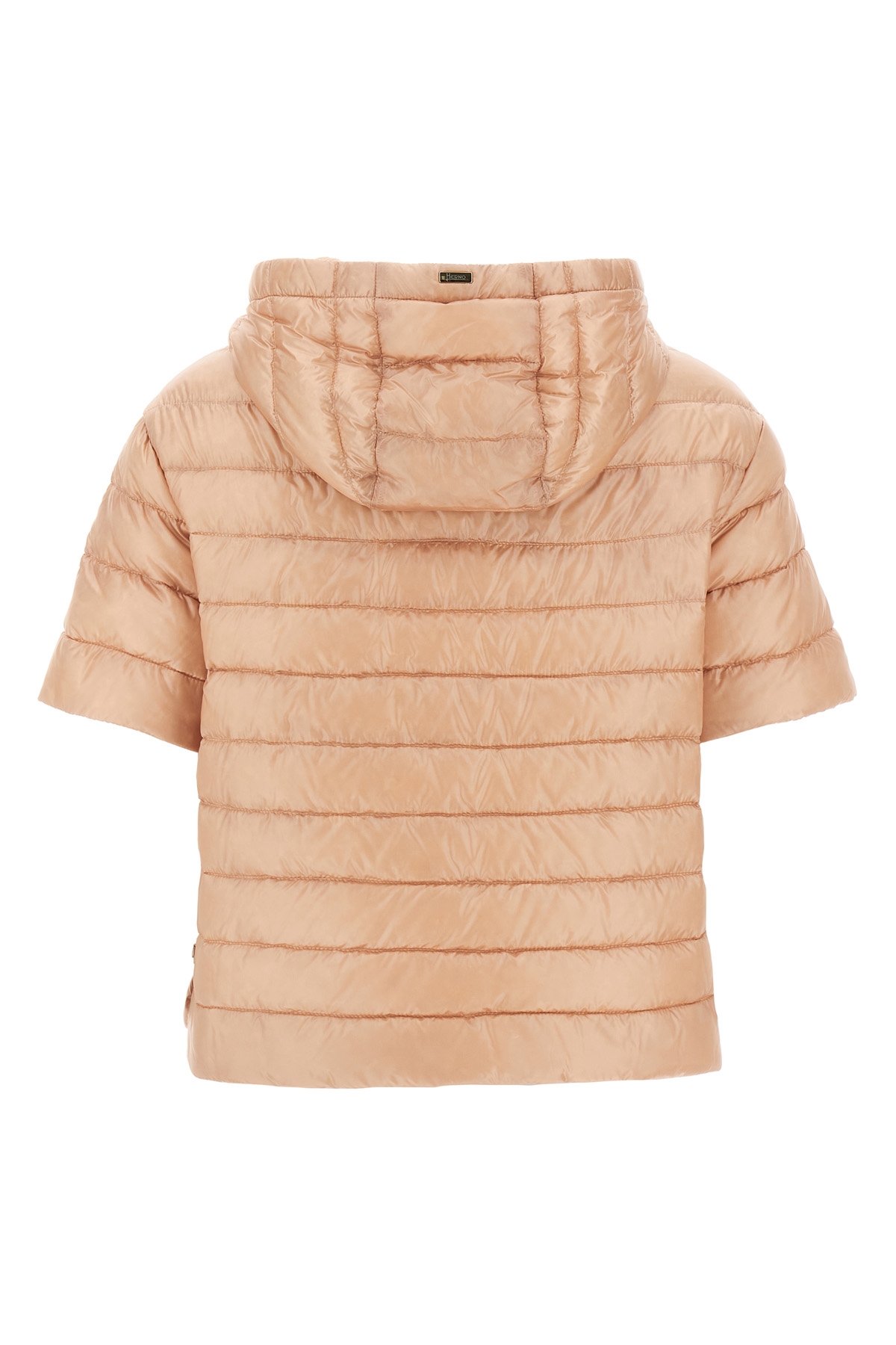 Ultralight quilted nylon down jacket with goose feather padding, hood, short sleeves, zip closure, pockets, side slits.