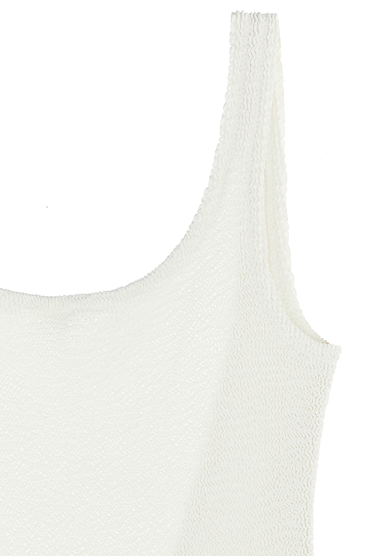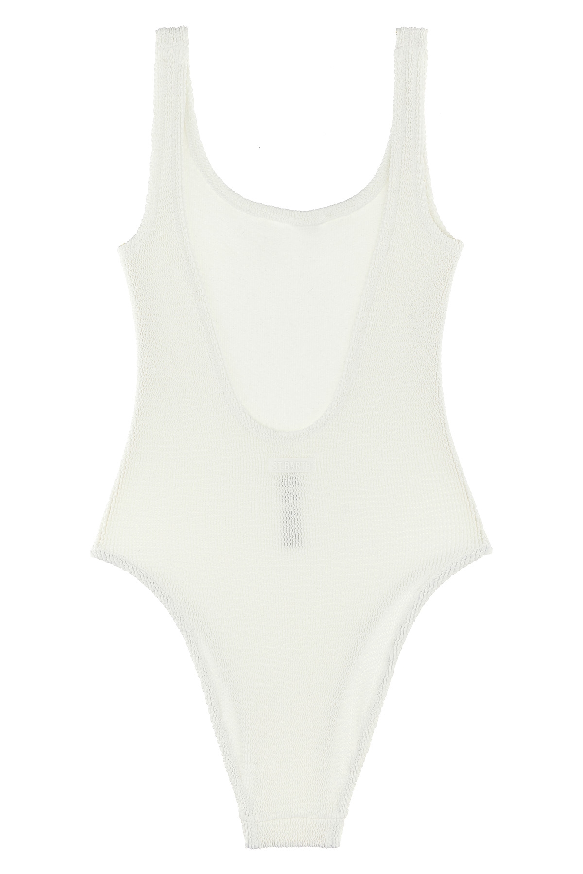 'Lora' crinkle fabric one-piece swimsuit with round neckline at the front, wide round neckline and back logo patch, and high-cut bottoms.