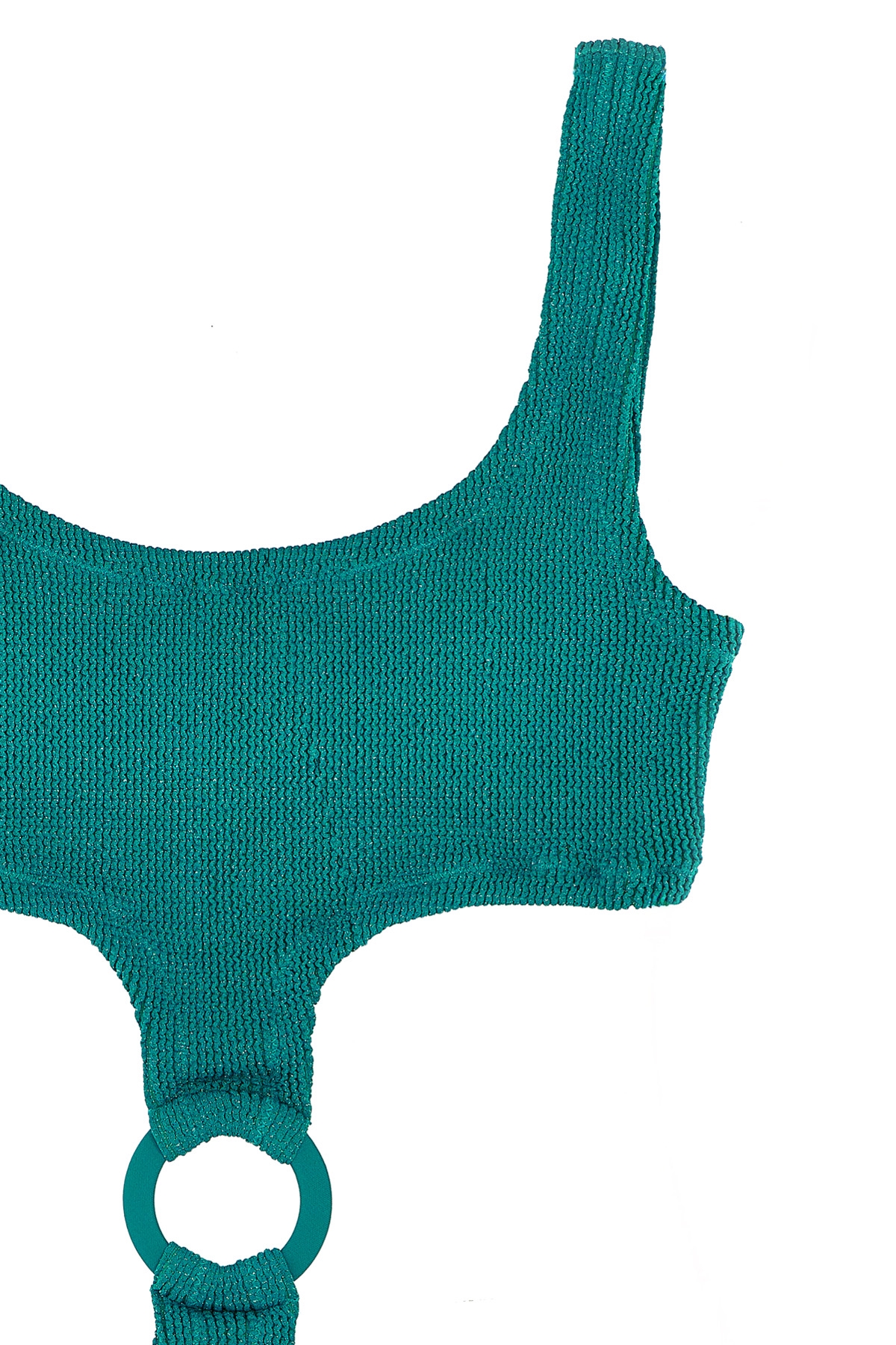 'Laurel' one-piece swimsuit in crinkle lurex fabric, trikini model with central ring and side cut-out details, round neckline at the front and back, back logo patch, and high-cut bottoms.