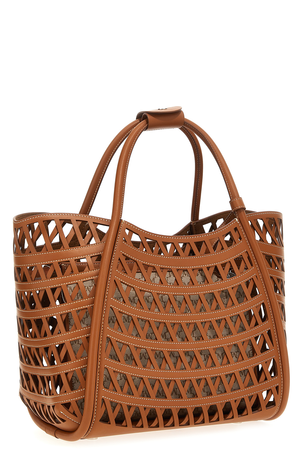 Small 'Marine' woven leather handbag with see-through effect cut-out details, front metal logo applique, double fixed handle, removable matching clutch, and metal details.