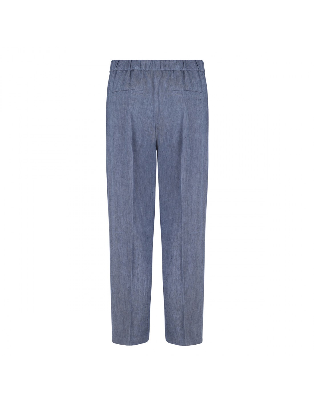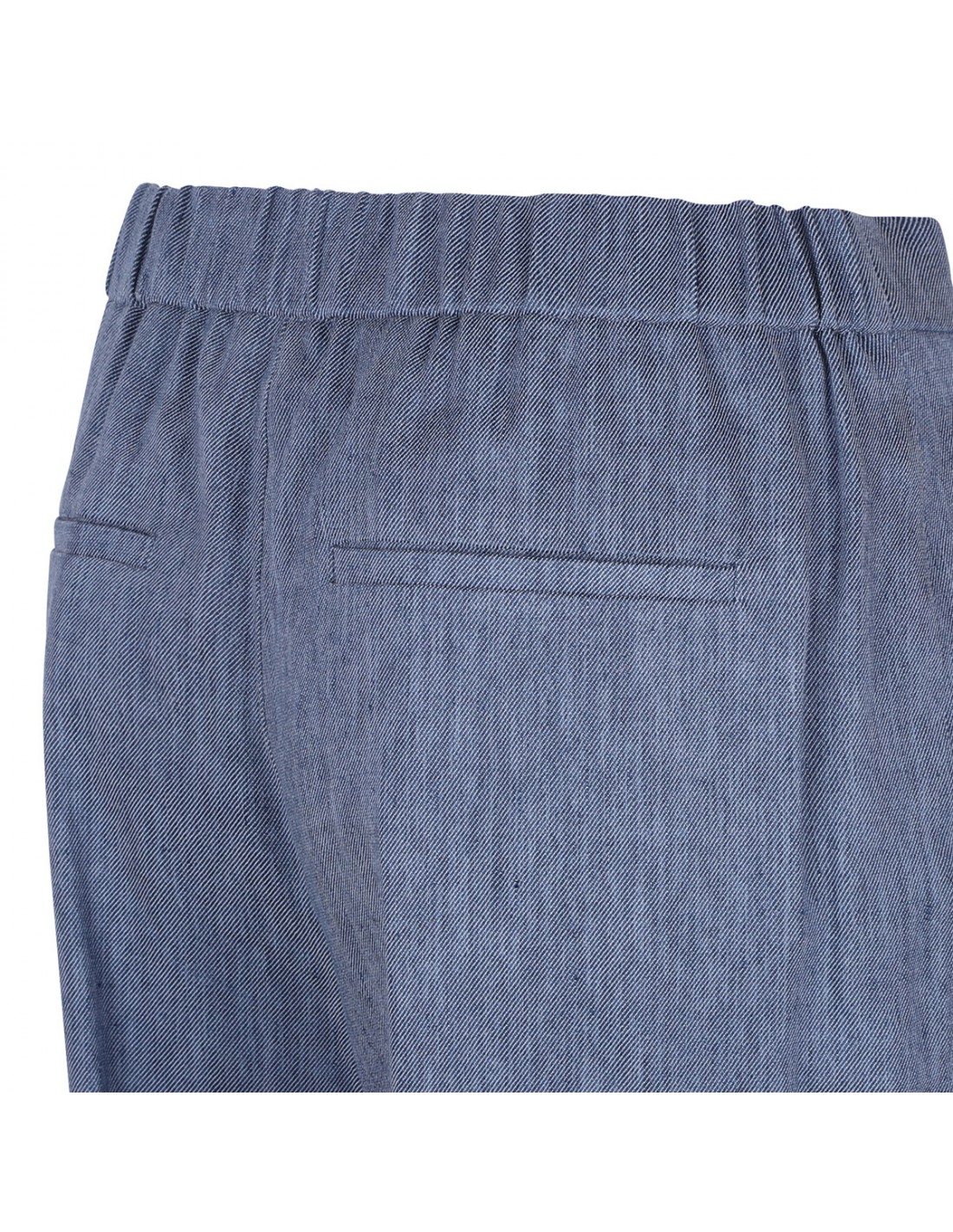 Lightweight linen blend pants from Theory featuring mid-rise, elastic waistband, side seam pockets, straight leg, single back pocket, ankle length.