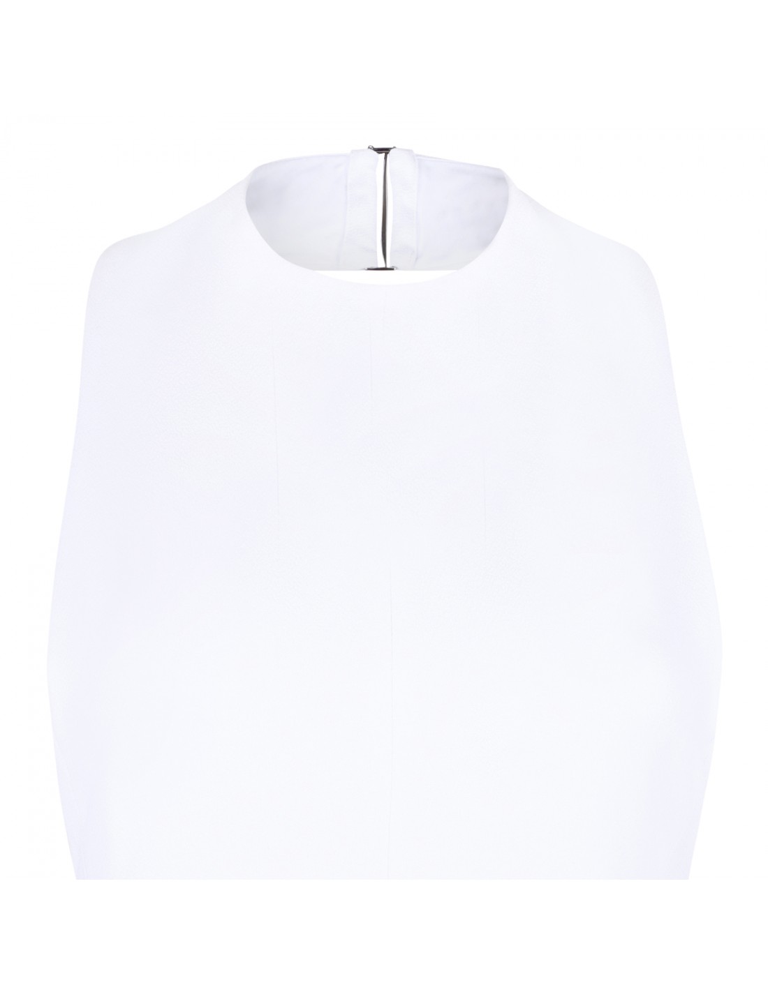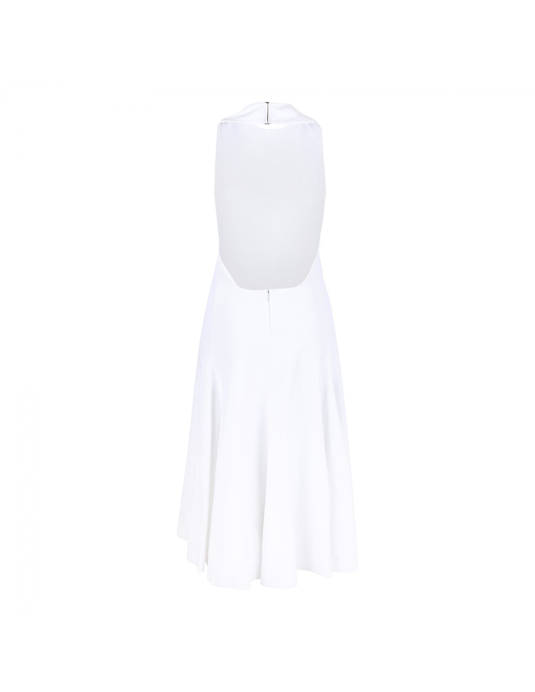 White stretch jersey The Favola dress from Jacquemus featuring high halter neck, mid-calf length, flared silhouette, metal buckled neckline on the back, concealed zip fastening at back.