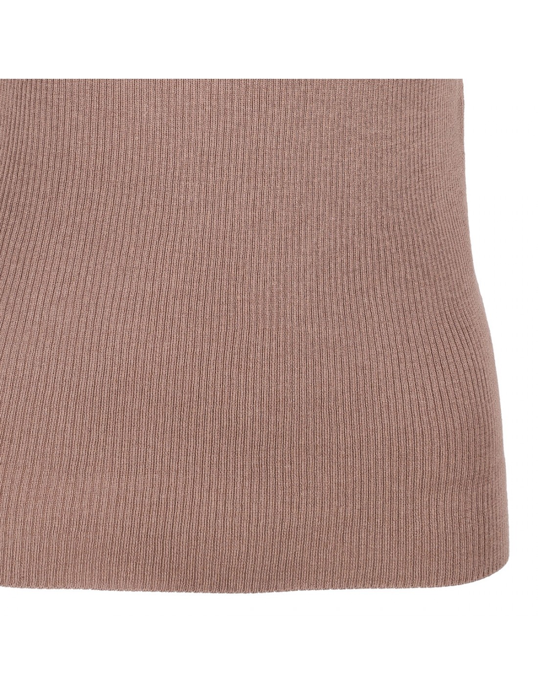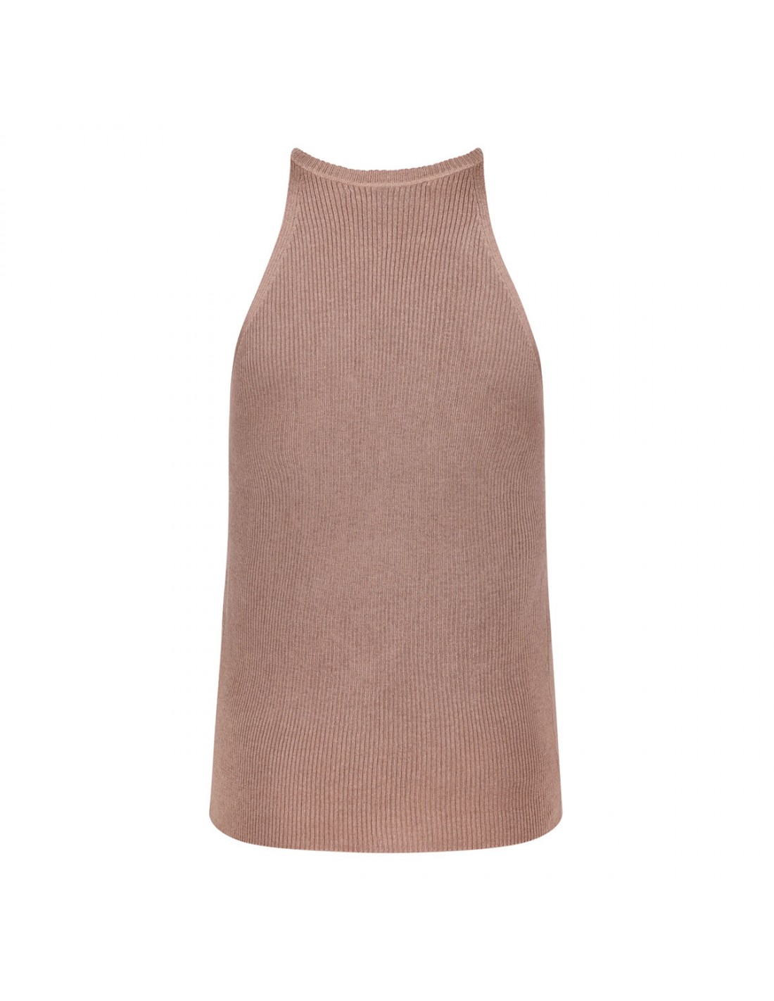 Camel hue silk and cashmere blend Yael tank top from Kujten featuring ribbed knit, scoop neck, fitted silhouette, sleeveless style.
