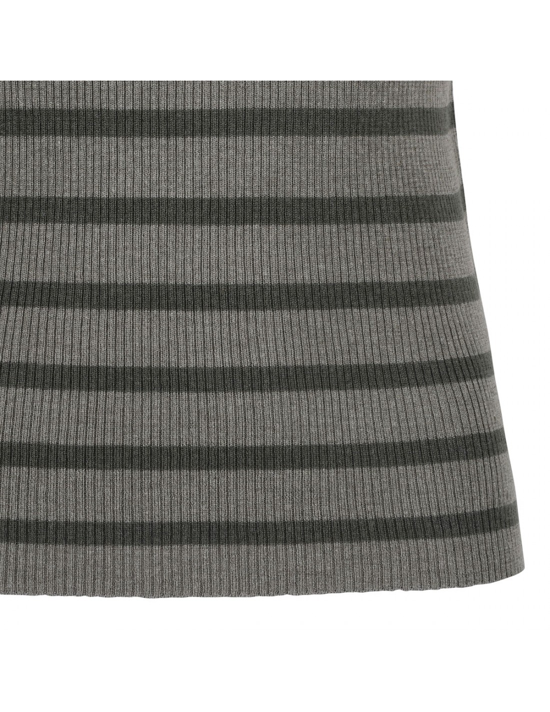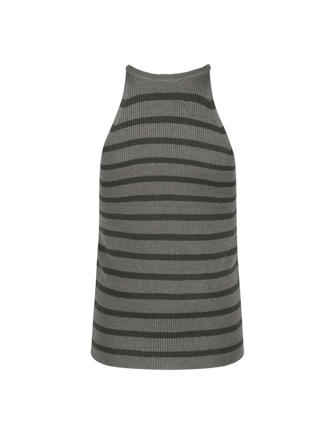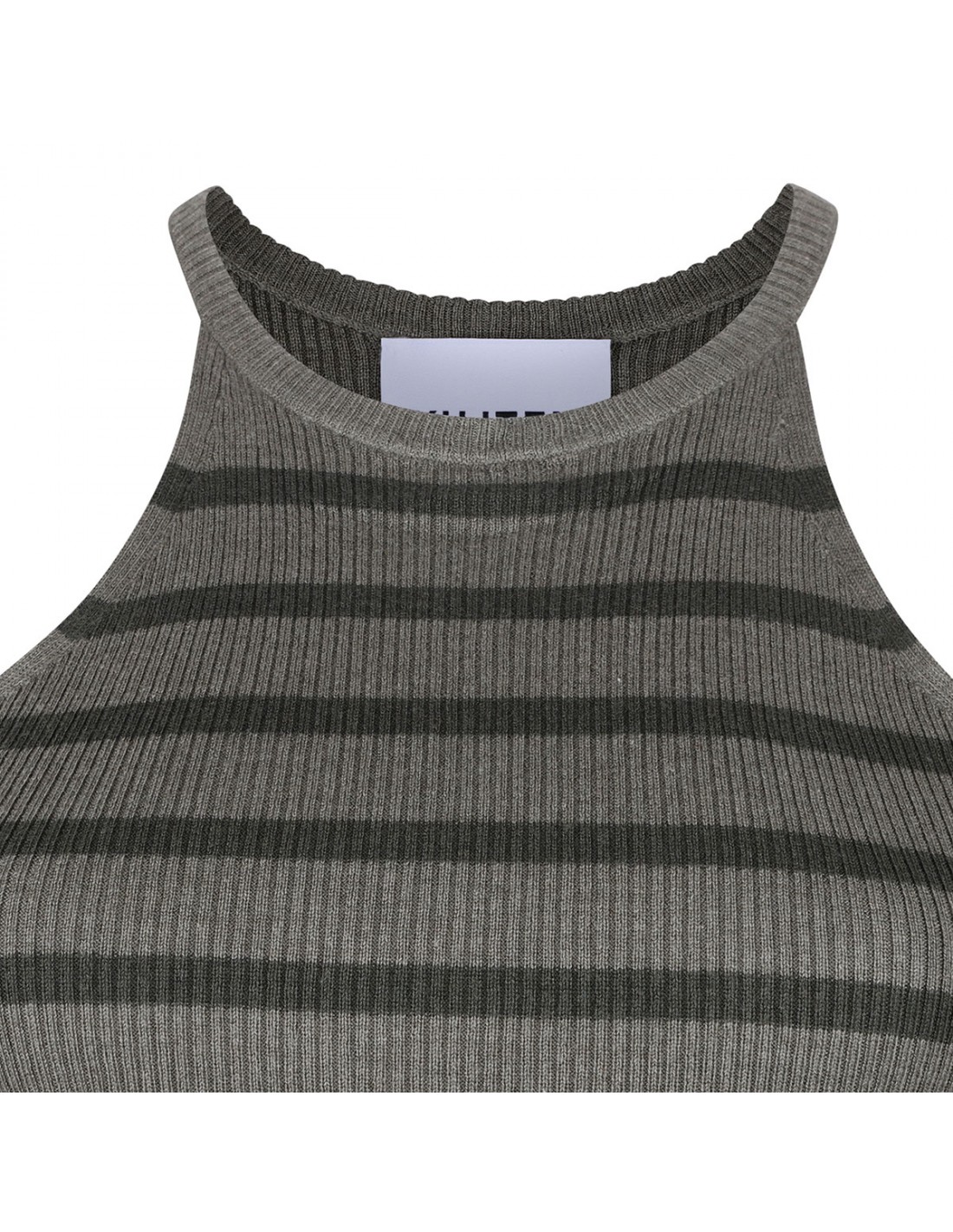 Dark and light khaki green silk and cashmere blend? Yael tank top from Kujten featuring striped motif, ribbed knit, scoop neck, fitted silhouette, sleeveless style.