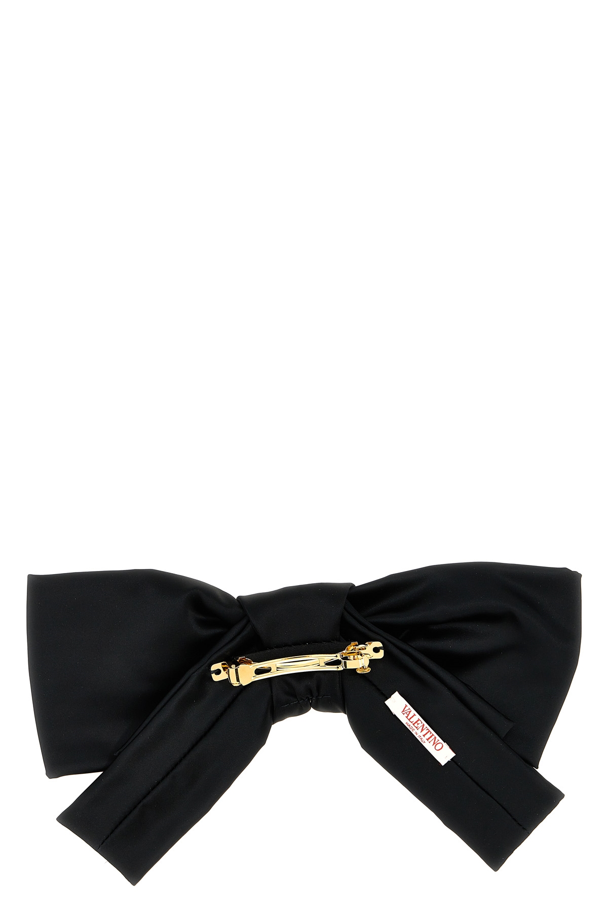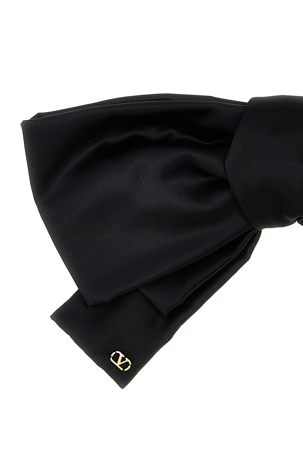 Satin hair clip in the shape of a bow with VLogo Signature metallic antiqued effect applied, clip closure.