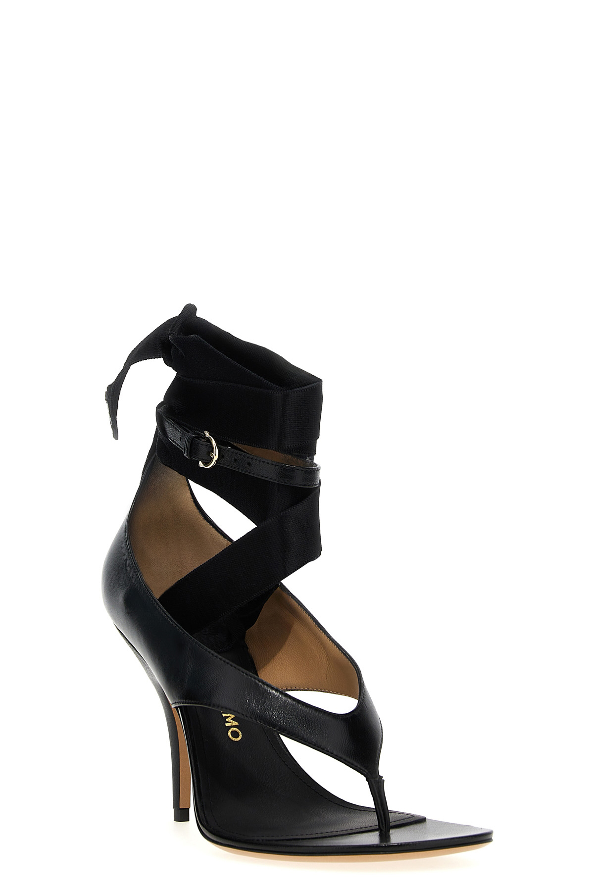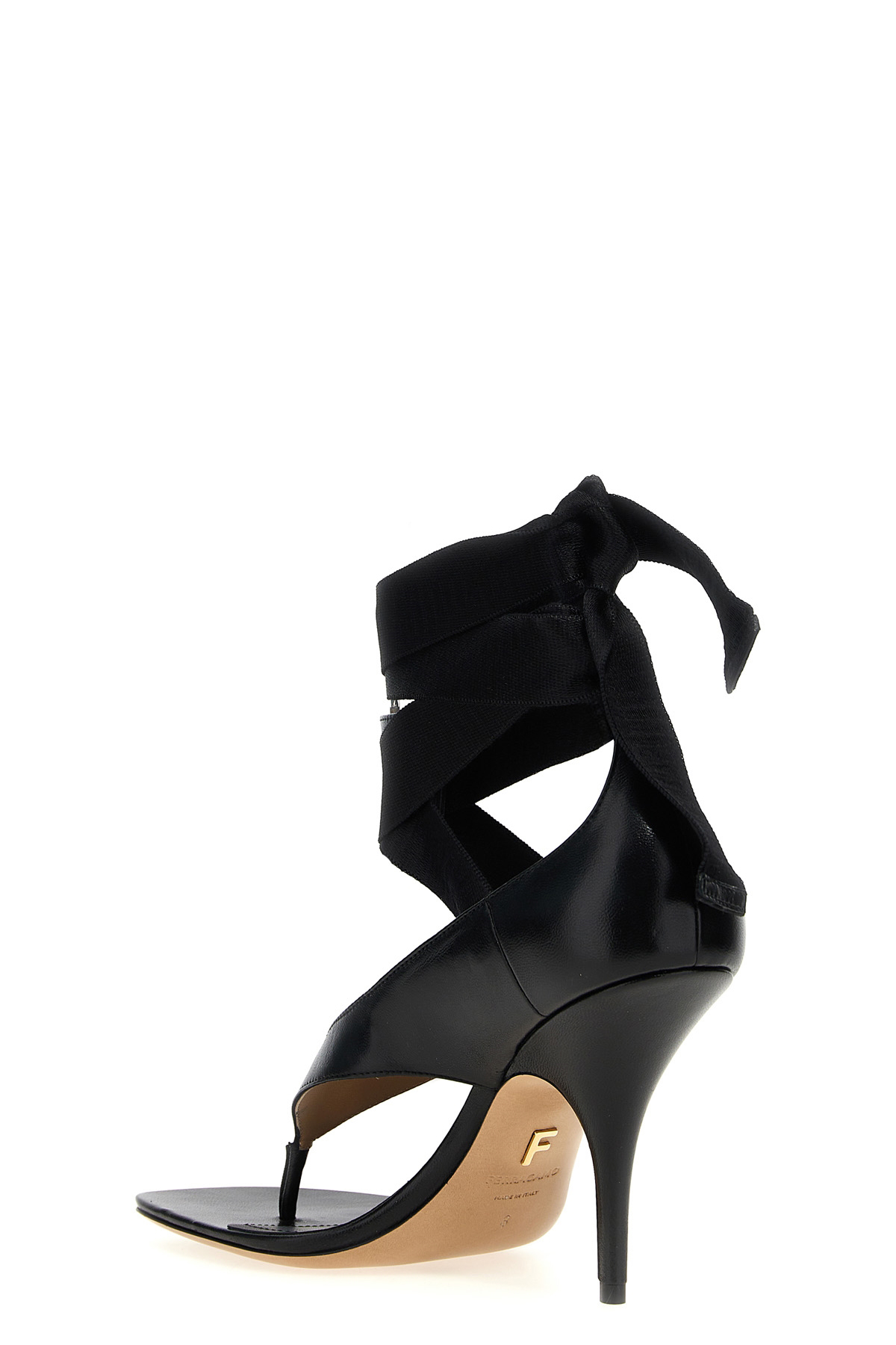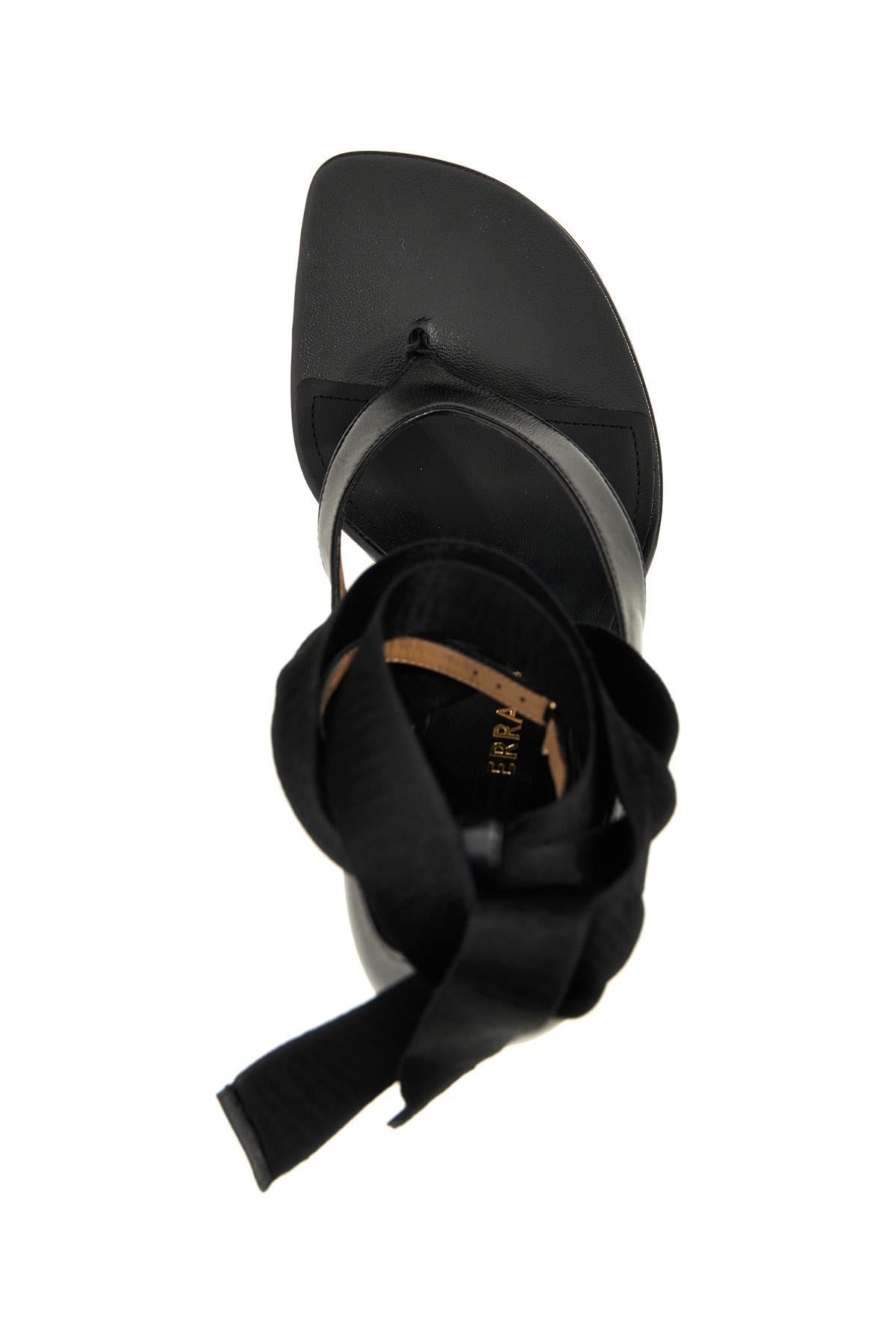 'Leliu' leather sandals with flip-flops style, adjustable ankle strap with satin ribbon to wrap around the calf, heel, leather sole.