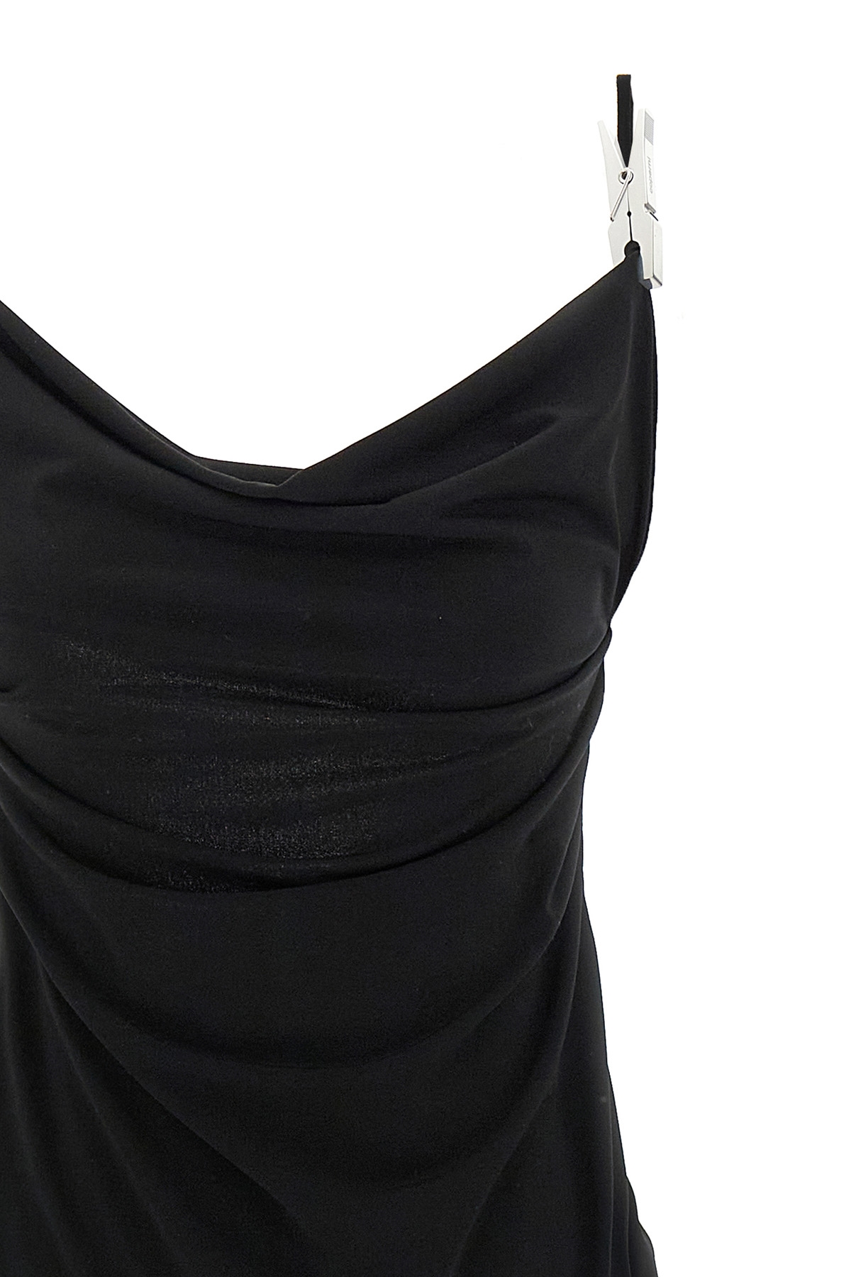 Washing Clip Gala' long dress in light jersey, draped neckline, sleeveless with thin straps, silver metal clothespin details at the front and back, wide asymmetrical neckline at the back, and slightly flared skirt.