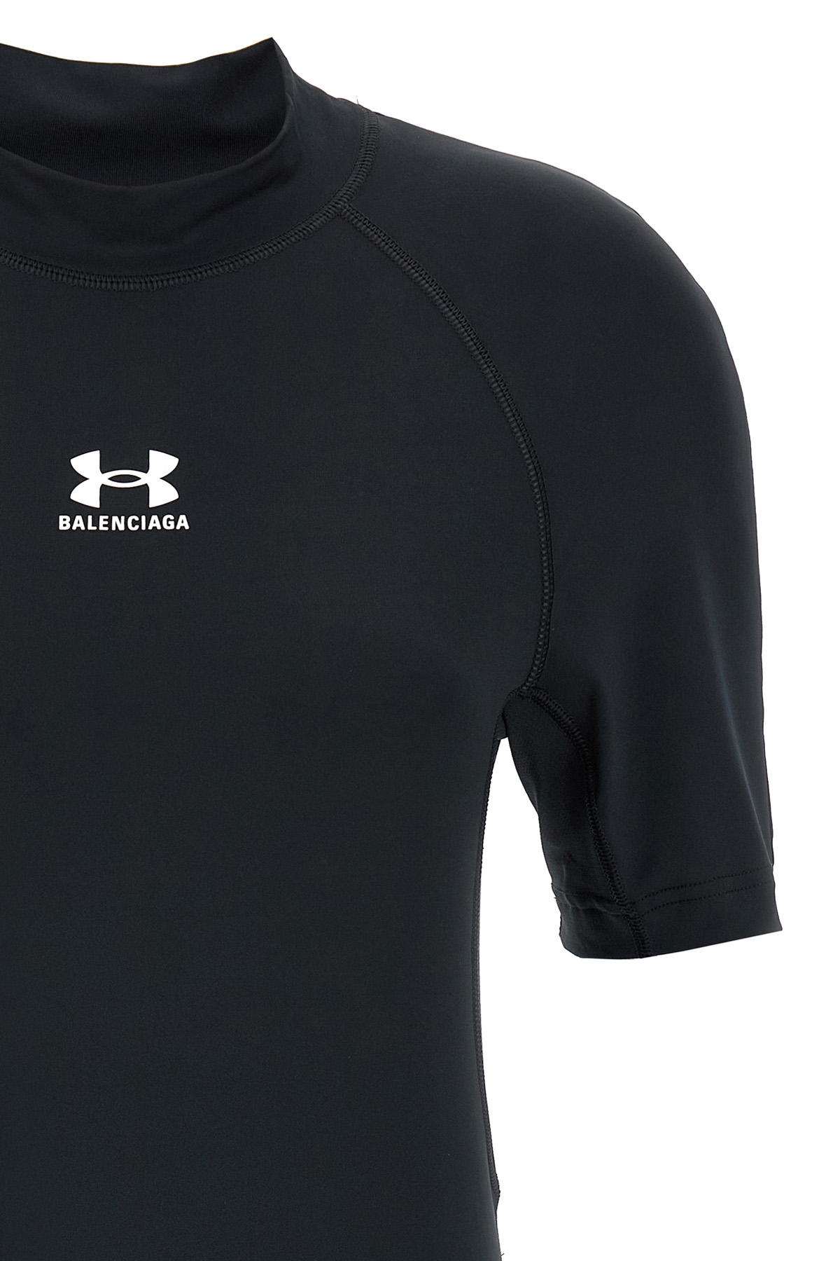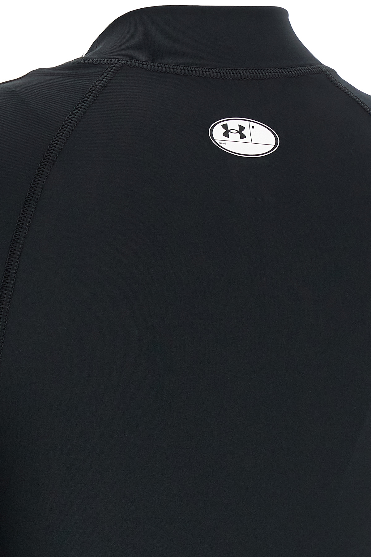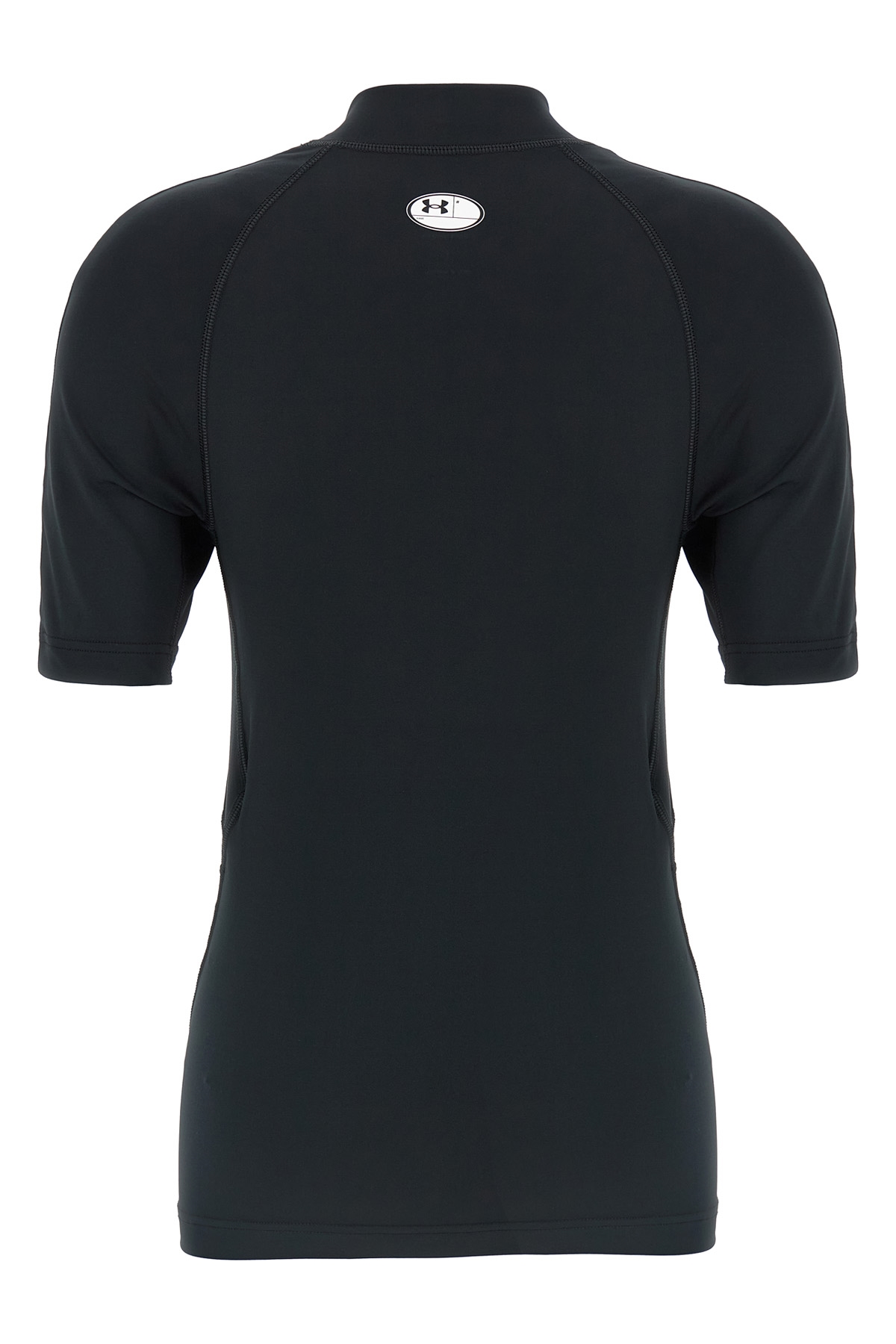 Under Armour® T-shirt in light spandex with logo print on the front and back, mock collar, and short sleeves.