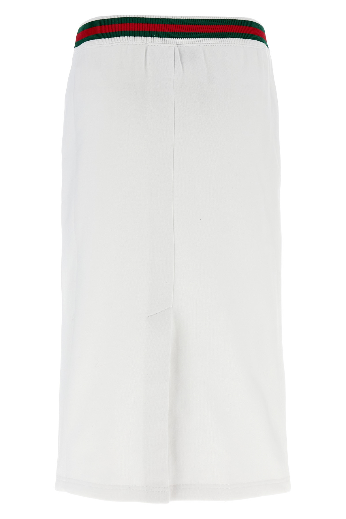 Cotton jersey midi skirt, Web fabric elastic with adjustable drawstring at the waist, front logo patch, pockets, back split.