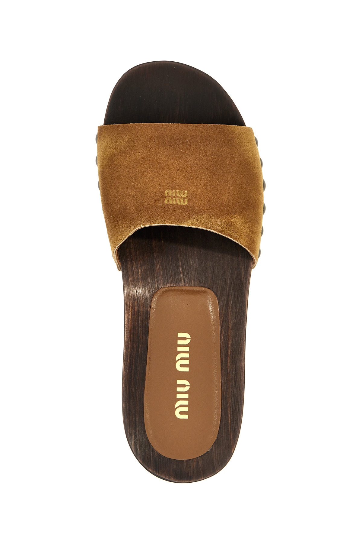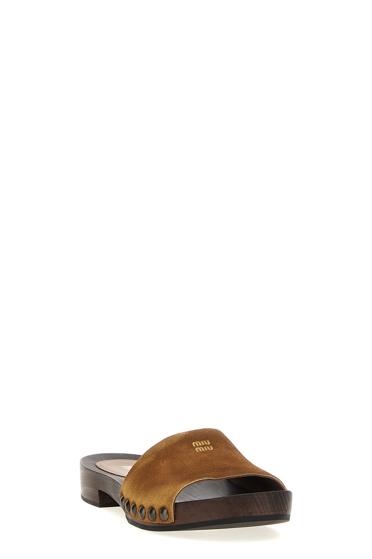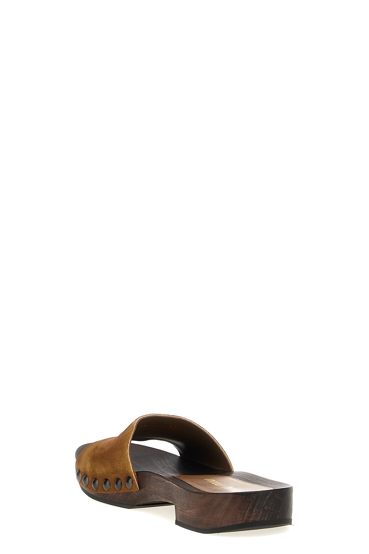 Delave suede clog, front embossed logo, wooden clog with half rubber sole on the heel.