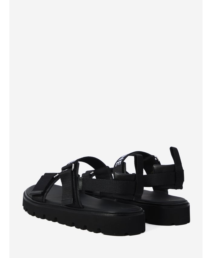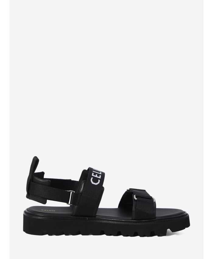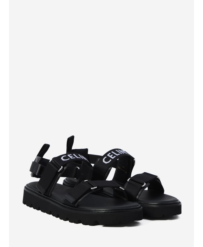 Jacquard fabric strappy sandals with the Celine logo in white. They feature two straps on the upper with Velcro closure, a rear strap with Velcro,
