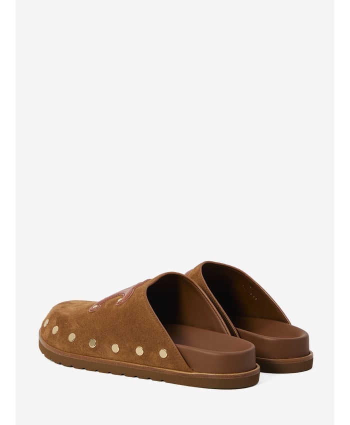Pitea clogs in Cognac suede calfskin. They feature a round toe, smooth brown leather Triomphe insert on the upper, golden metal details on the sides,