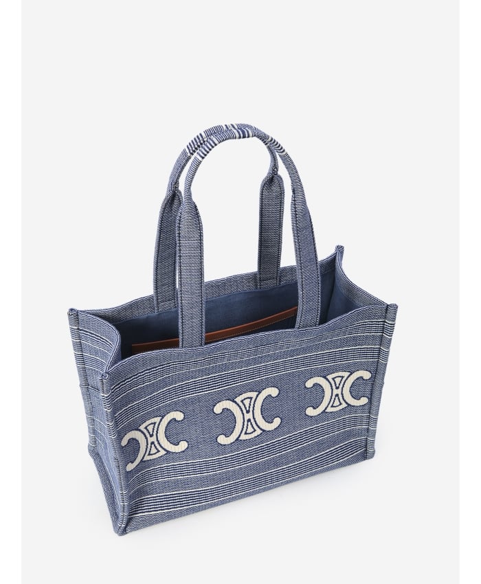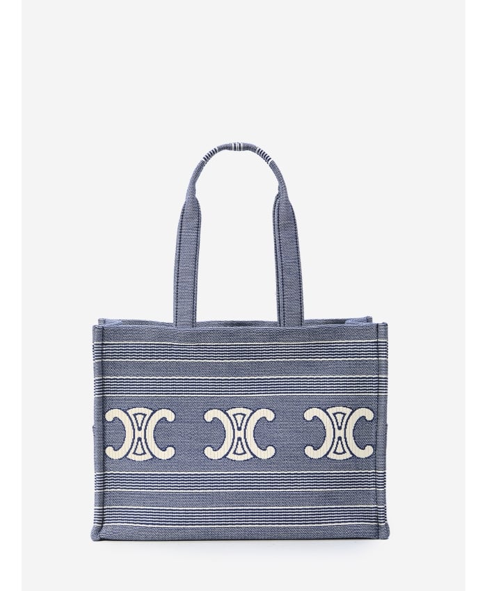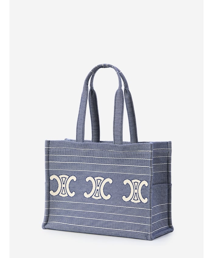 Tote bag in stretch cotton with blue and white striped pattern and Triomphe. It features two top handles, two flat side pockets, one main internal