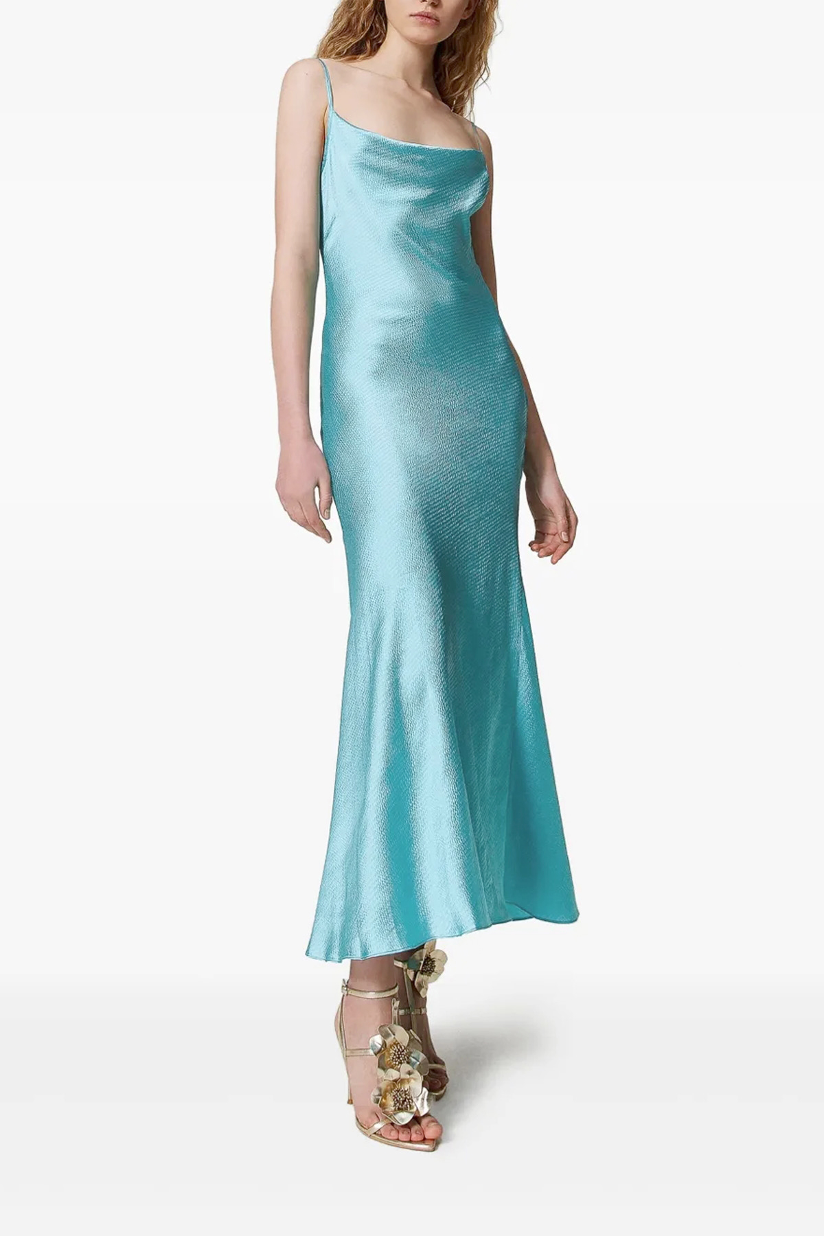 Long satin dress, sleeveless, thin straps, draped neckline, mermaid skirt, metal Oval T logo on the back.