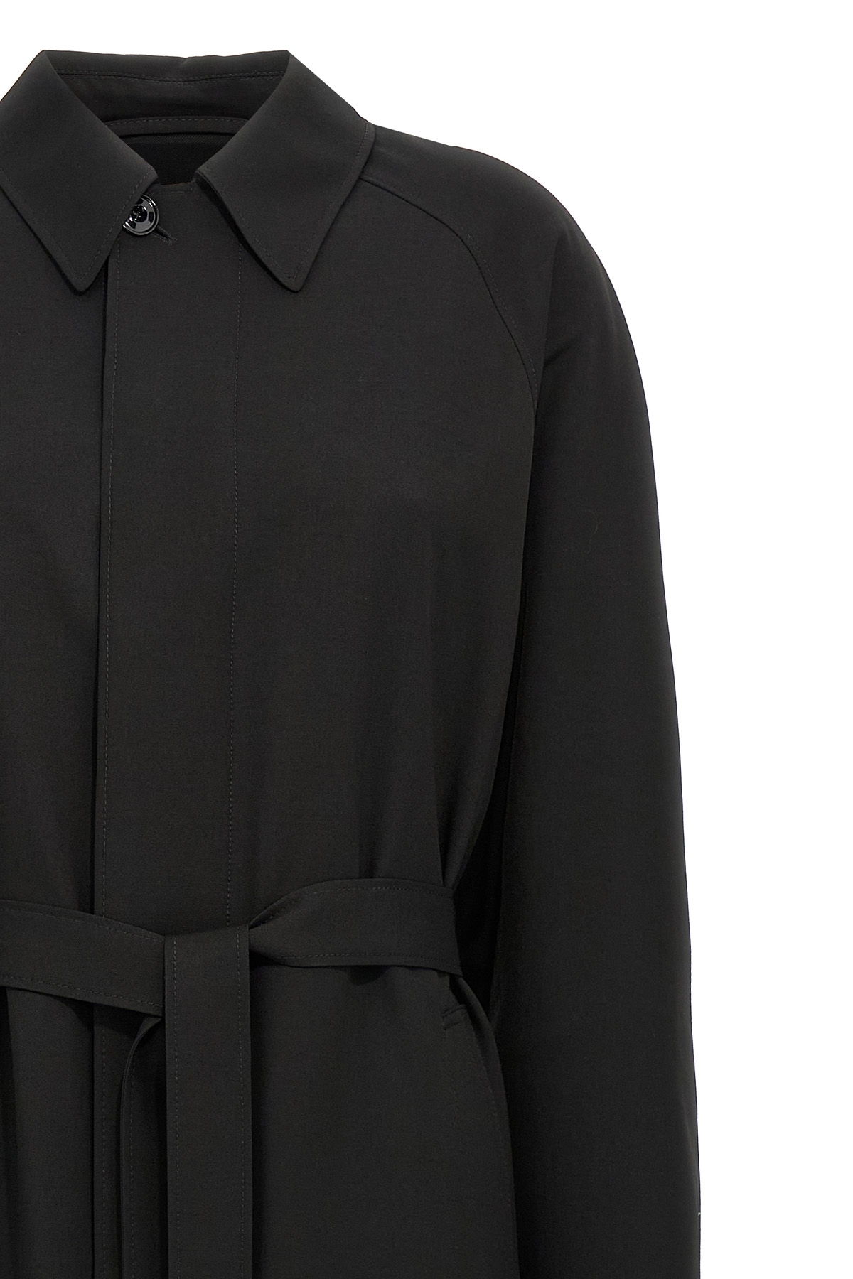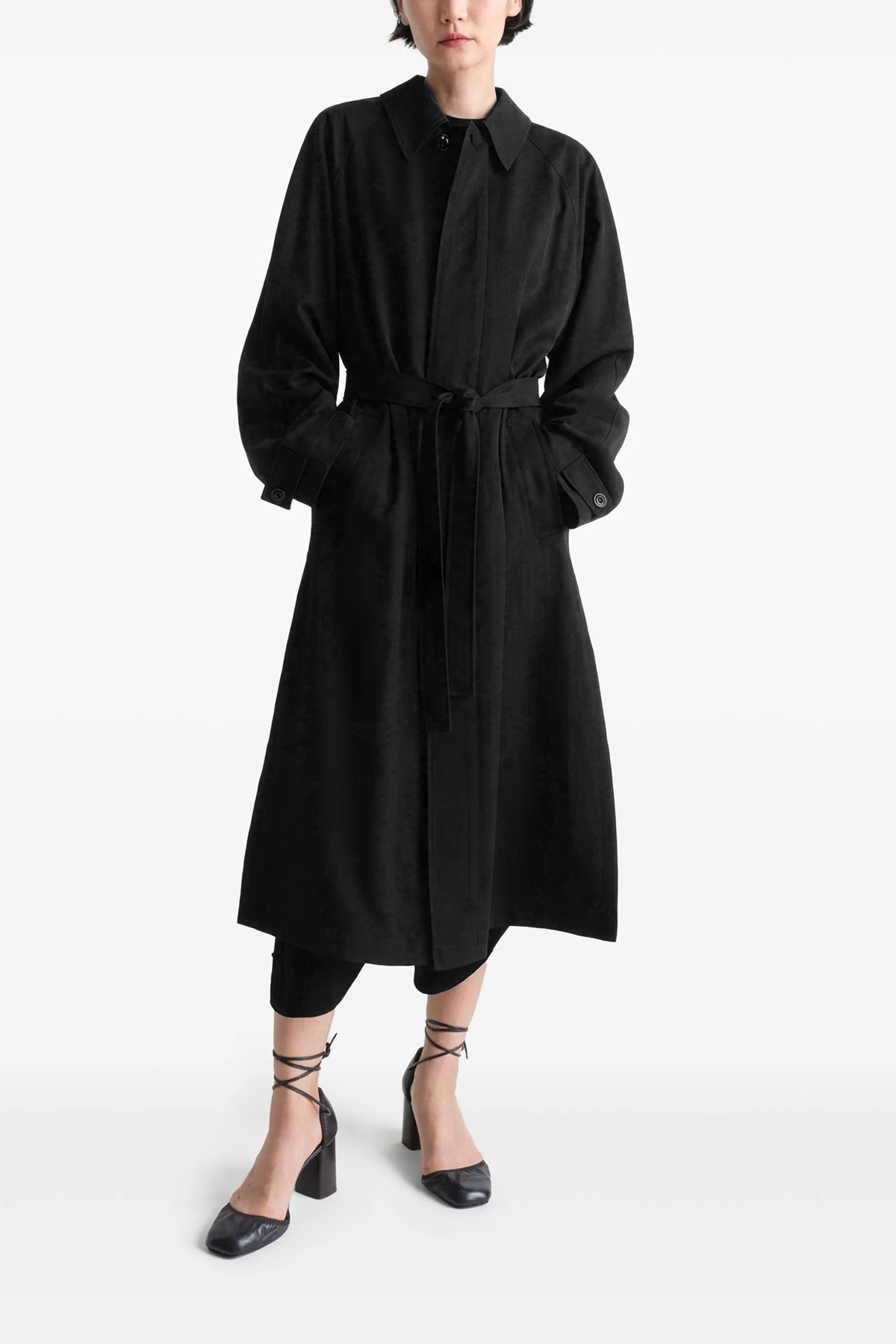 Wool and viscose blend trench coat, front button closure, pockets, unlined, long cuffed sleeves, removable belt.